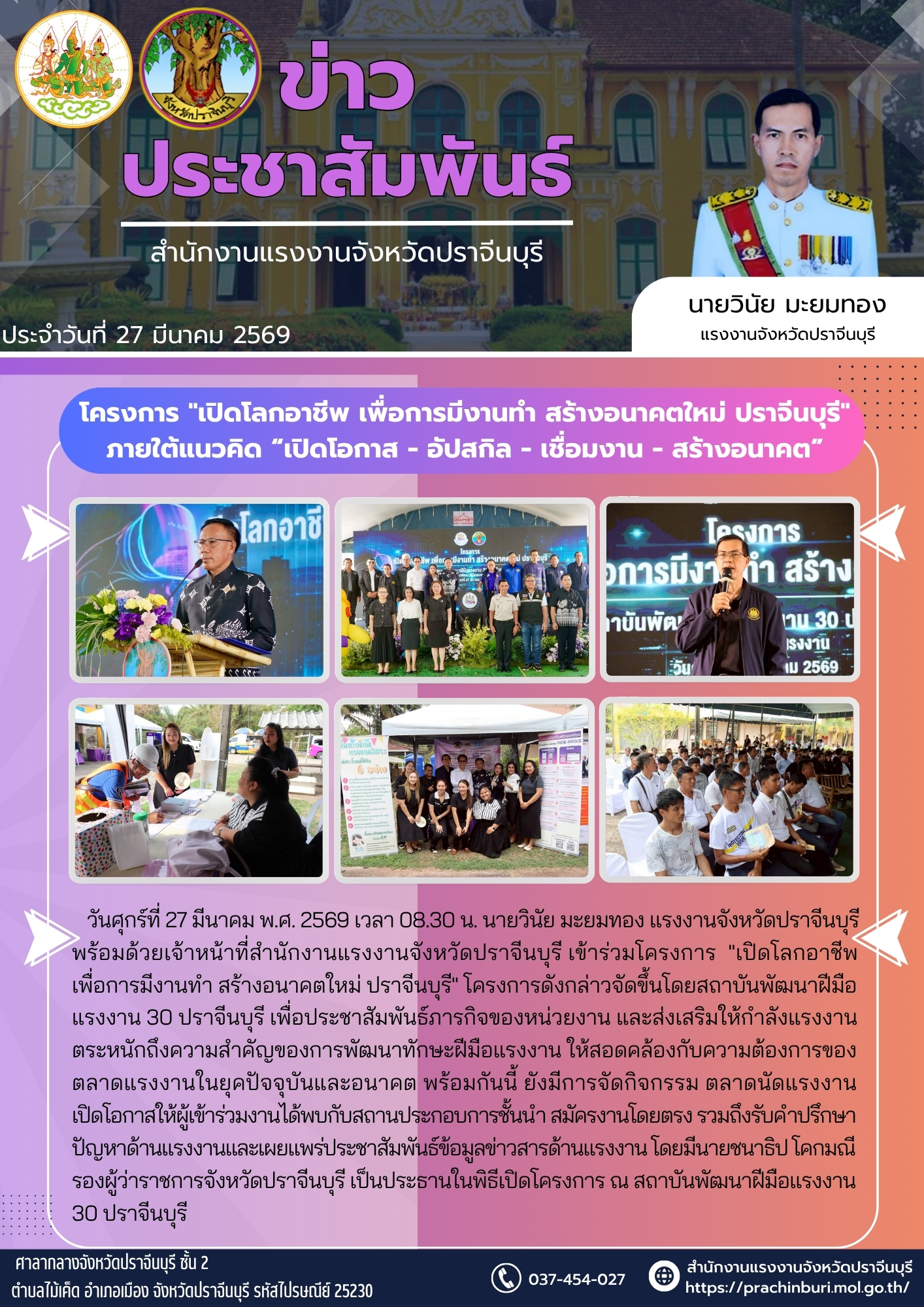โครงการ “เปิดโลกอาชีพ เพื่อการมีงานทำ สร้างอนาคตใหม่ ปราจีนบุรี” ภายใต้แนวคิด “เปิดโอกาส – อัปสกิล – เชื่อมงาน – สร้างอนาคต”