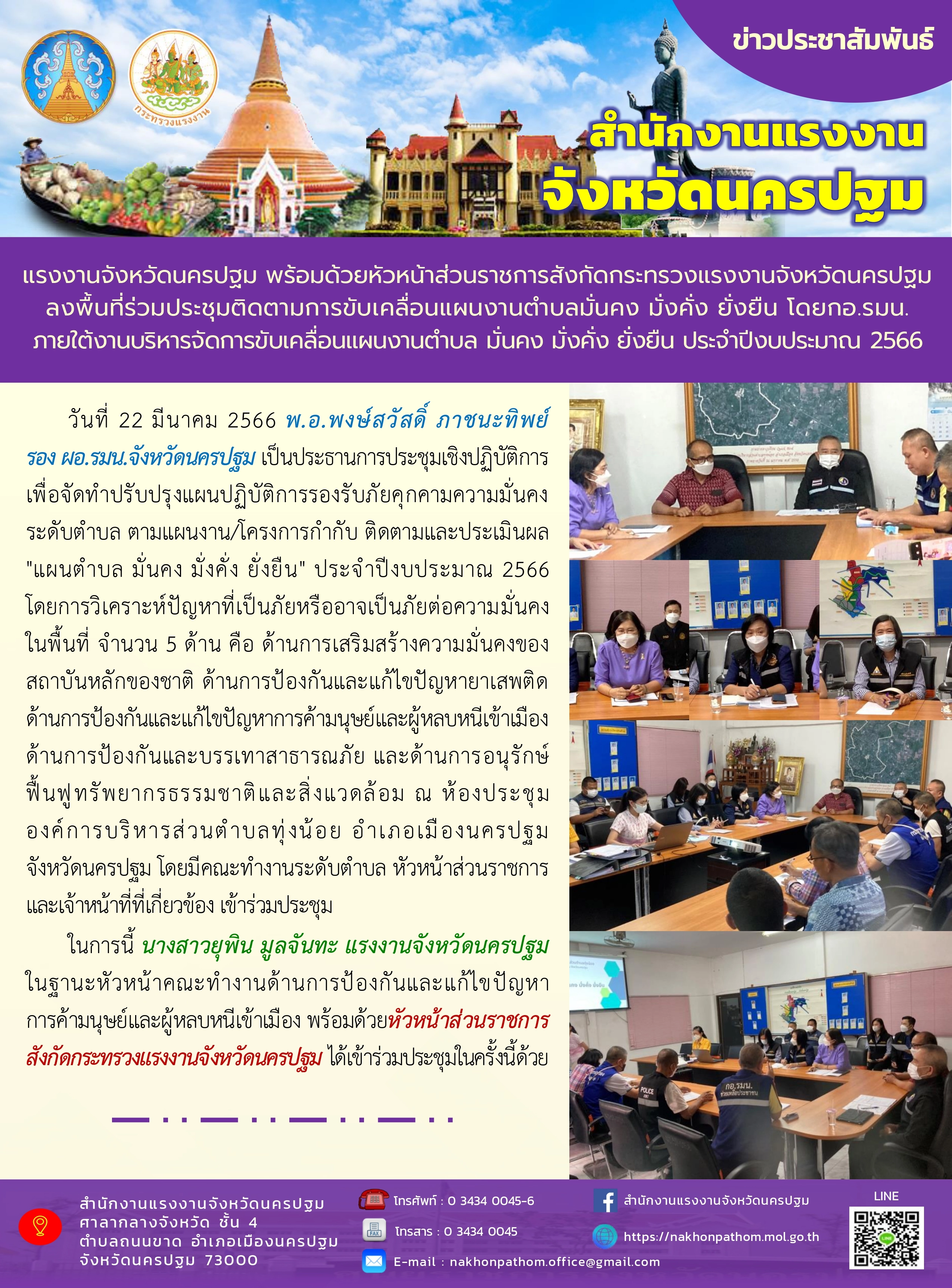 สรจ.นครปฐม พร้อมด้วยหัวหน้าส่วนราชการสังกัดกระทรวงแรงงานจังหวัดนครปฐม ลงพื้นที่ร่วมประชุมติดตามการขับเคลื่อนแผนงานตำบลมั่นคง มั่งคั่ง ยั่งยืน โดยกอ.รมน. ภายใต้งานบริหารจัดการขับเคลื่อนแผนงานตำบล มั่นคง มั่งคั่ง ยั่งยืน ประจำปีงบประมาณ 2566