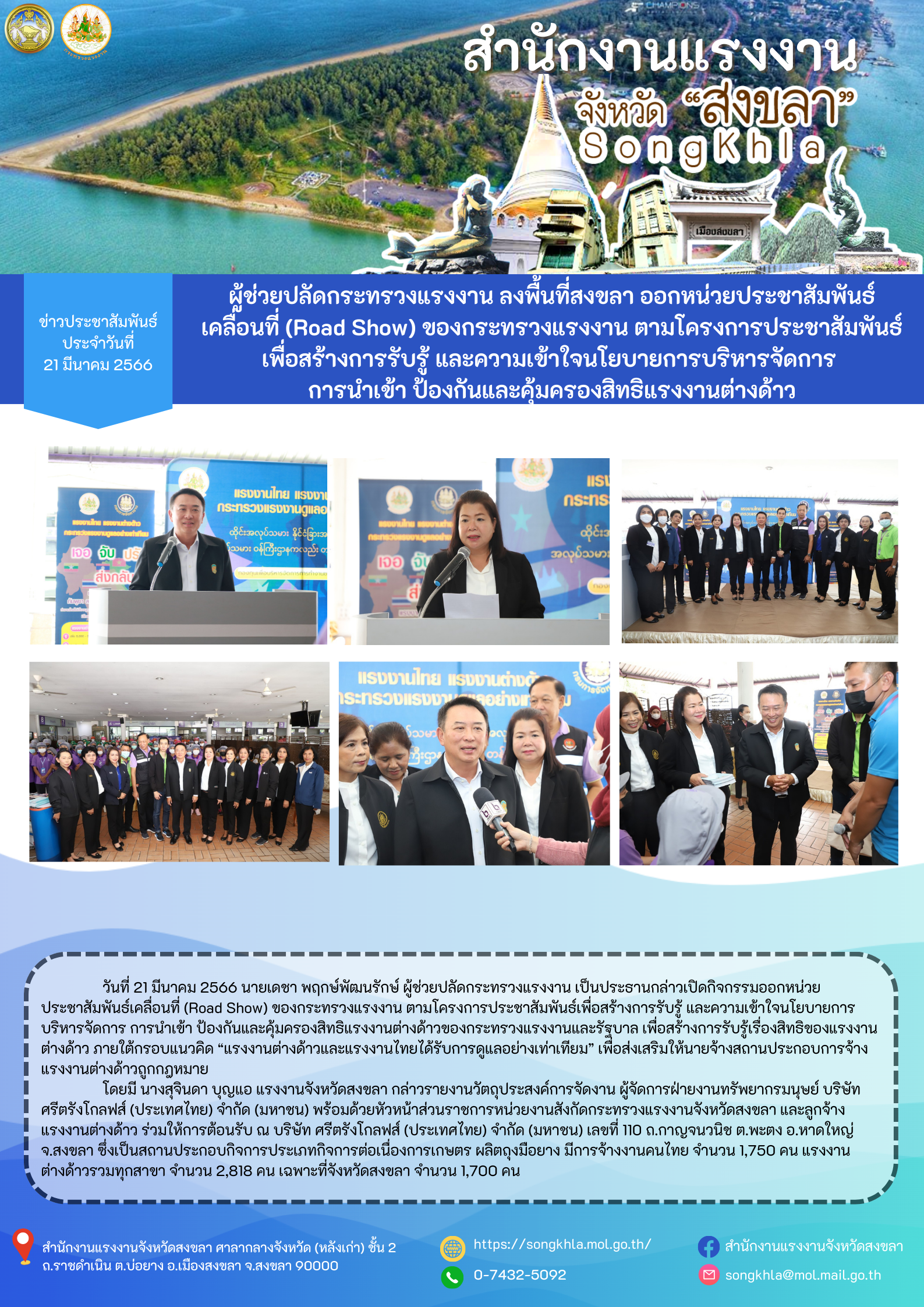 ผู้ช่วยปลัดกระทรวงแรงงาน ลงพื้นที่สงขลา ออกหน่วยประชาสัมพันธ์เคลื่อนที่ (Road Show) ของกระทรวงแรงงาน ตามโครงการประชาสัมพันธ์เพื่อสร้างการรับรู้ และความเข้าใจนโยบายการบริหารจัดการ การนำเข้า ป้องกันและคุ้มครองสิทธิแรงงานต่างด้าวของกระทรวงแรงงานและรัฐบาล