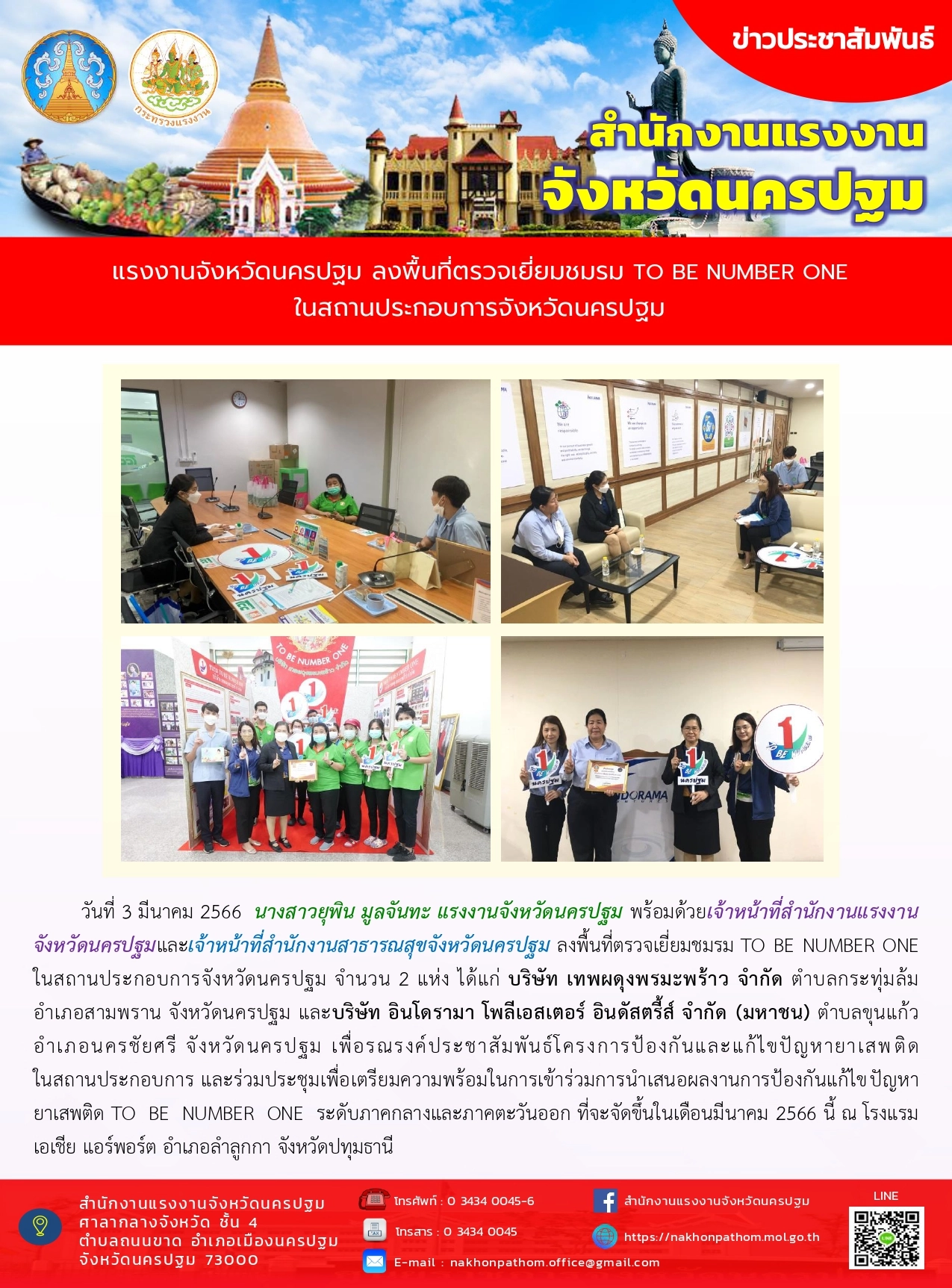 แรงงานจังหวัดนครปฐม ลงพื้นที่ตรวจเยี่ยมชมรม TO BE NUMBER ONE ในสถานประกอบการจังหวัดนครปฐม