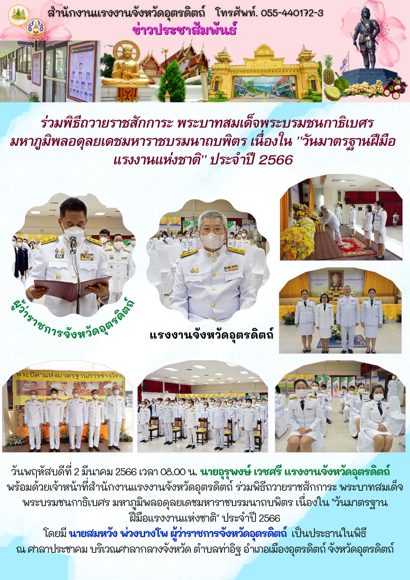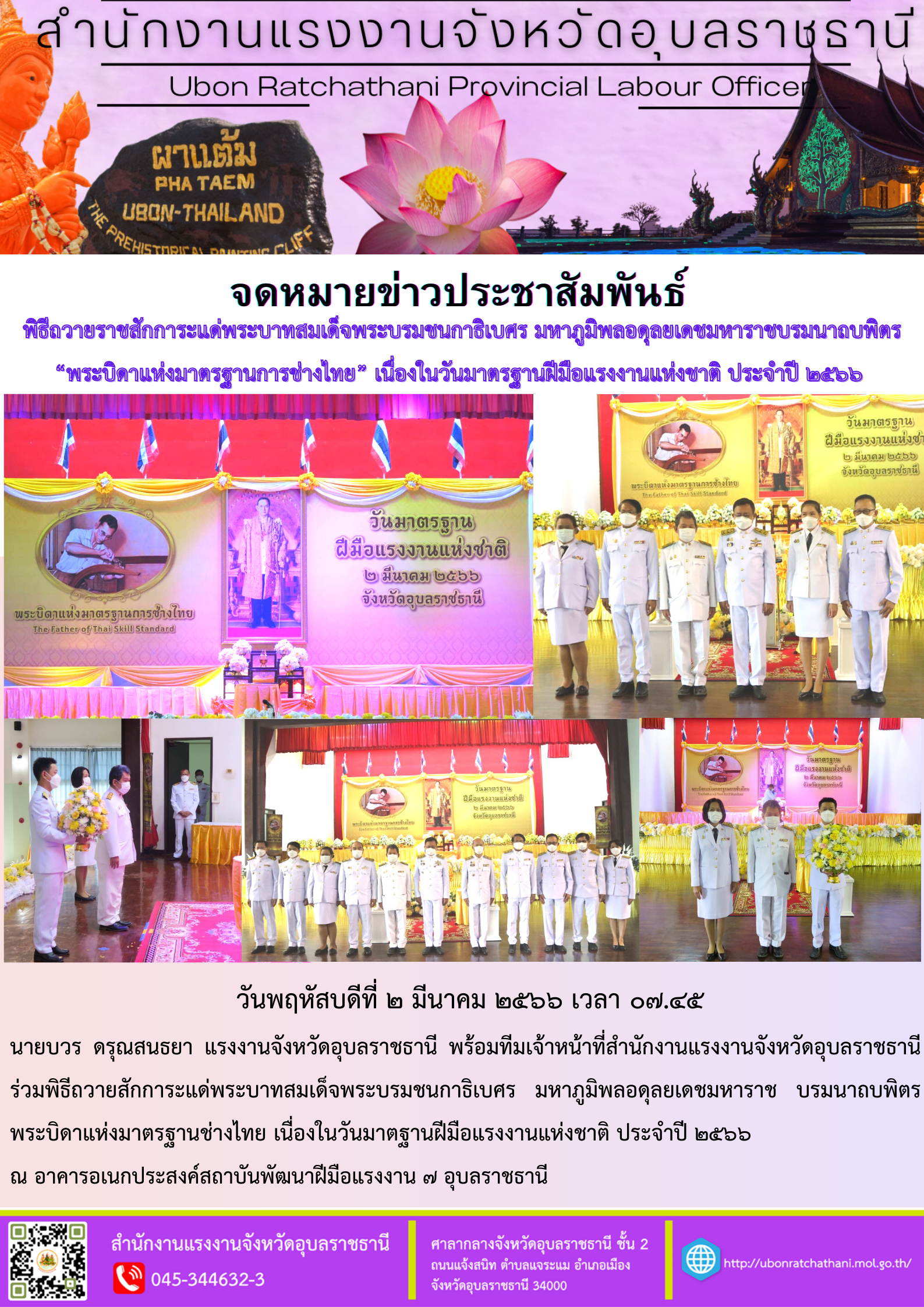 สรจ.อุบลราชธานี พิธีถวายราชสักการะแด่พระบาทสมเด็จพระบรมชนกาธิเบศร มหาภูมิพลอดุลยเดชมหาราชบรมนาถบพิตร “พระบิดาแห่งมาตรฐานการช่างไทย” เนื่องในวันมาตรฐานฝีมือแรงงานแห่งชาติ ประจำปี ๒๕๖๖