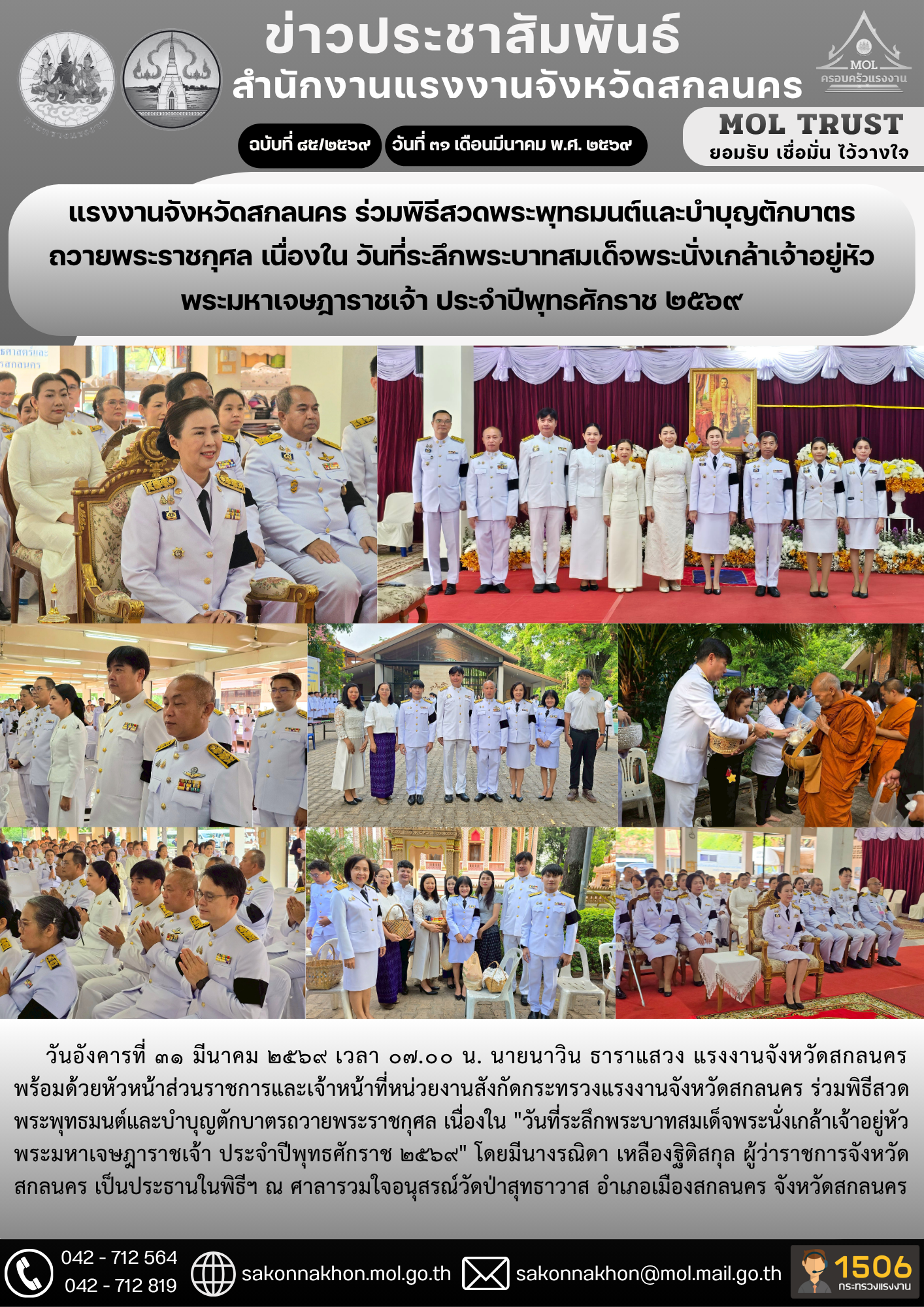 แรงงานจังหวัดสกลนคร ร่วมพิธีสวดพระพุทธมนต์และบำบุญตักบาตร ถวายพระราชกุศล เนื่องใน วันที่ระลึกพระบาทสมเด็จพระนั่งเกล้าเจ้าอยู่หัว พระมหาเจษฎาราชเจ้า ประจำปีพุทธศักราช 2569