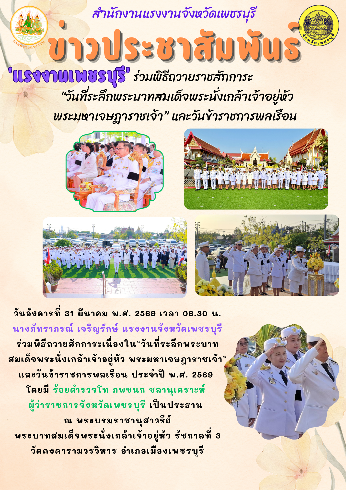 ‘แรงงานเพชรบุรี’ ร่วมพิธีถวายราชสักการะ “วันที่ระลึกพระบาทสมเด็จพระนั่งเกล้าเจ้าอยู่หัว พระมหาเจษฎาราชเจ้า” และวันข้าราชการพลเรือน