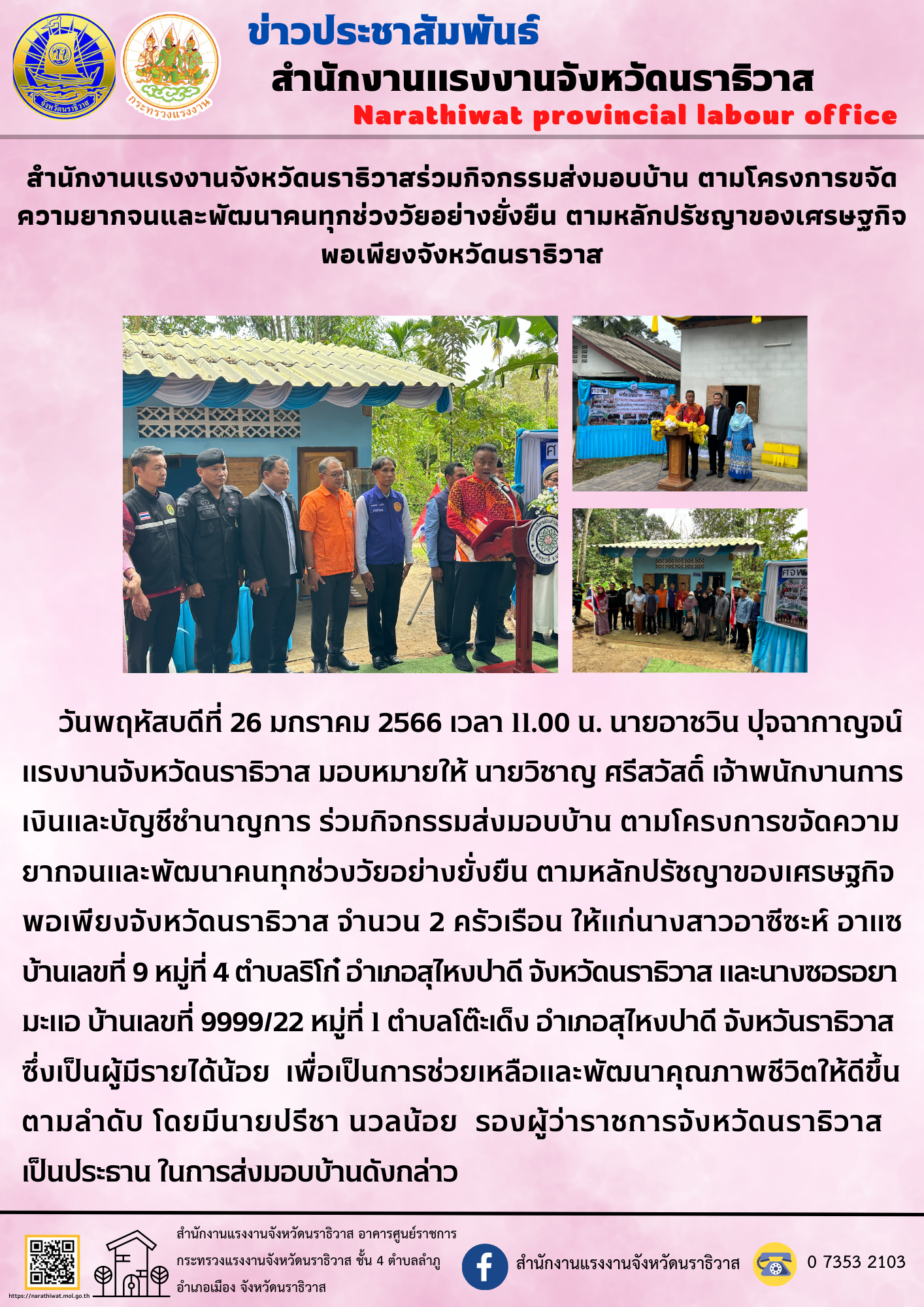 สรจ.นราธิวาส ร่วมกิจกรรมส่งมอบบ้าน ตามโครงการขจัดความยากจนและพัฒนาคนทุกช่วงวัยอย่างยั่งยืน ตามหลักปรัชญาของเศรษฐกิจ พอเพียงจังหวัดนราธิวาส