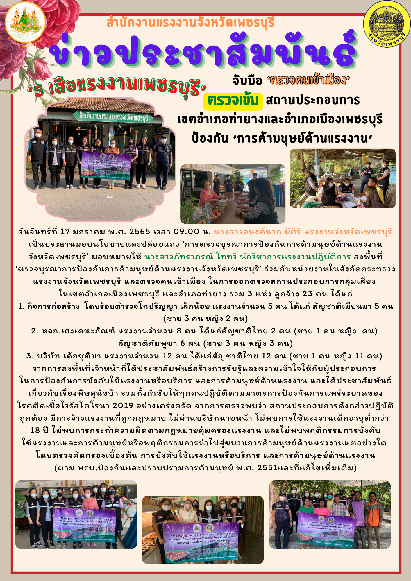 ‘5 เสือแรงงานเพชรบุรี’ จับมือ ‘ตรวจคนเข้าเมือง’ ตรวจเข้ม สถานประกอบการเขตอำเภอท่ายางและอำเภอเมืองเพชรบุรี ป้องกัน ‘การค้ามนุษย์ด้านแรงงาน’
