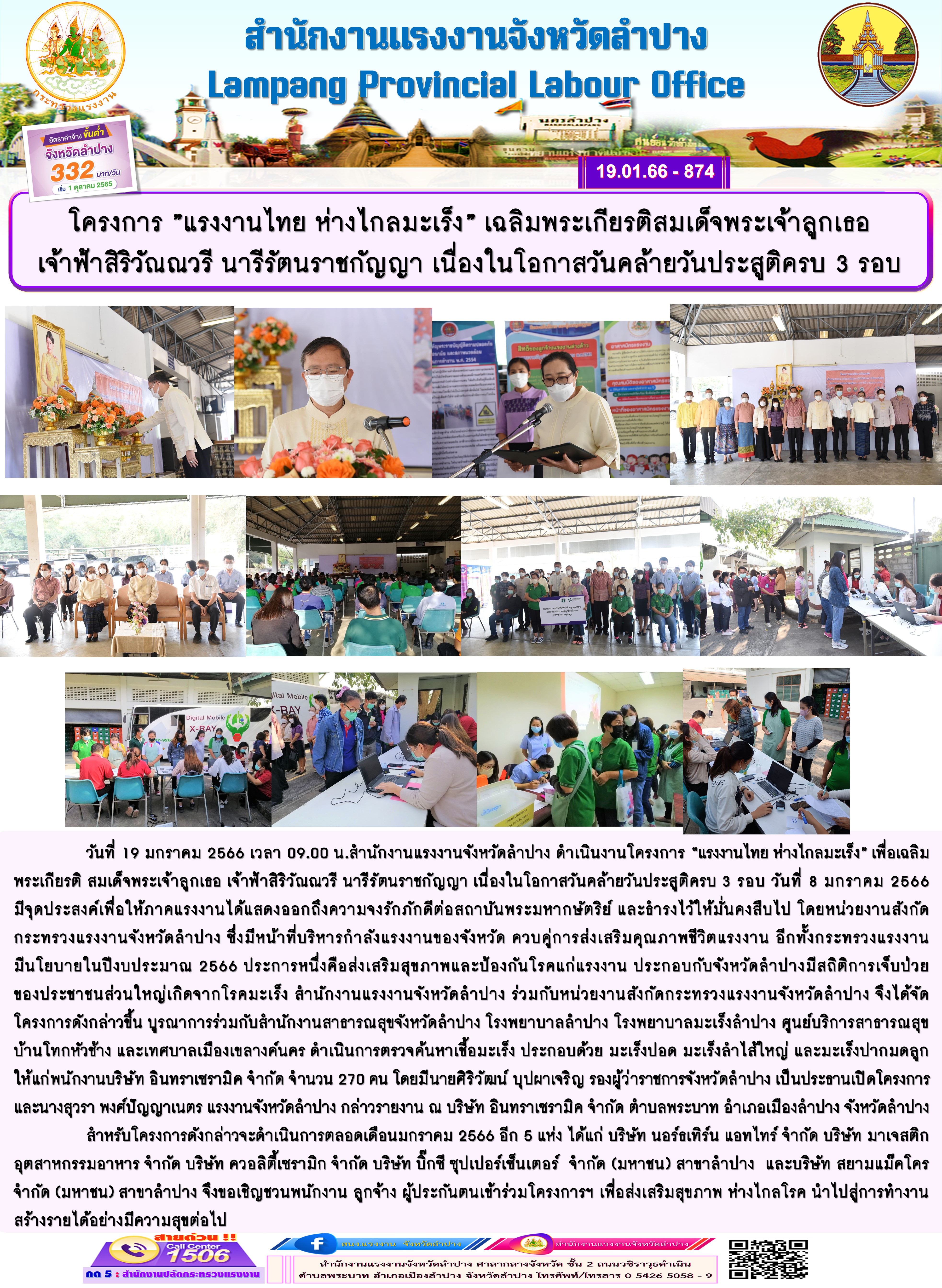 โครงการ “แรงงานไทย ห่างไกลมะเร็ง ” เพื่อเฉลิมพระเกียรติ สมเด็จพระเจ้าลูกเธอ เจ้าฟ้าสิริวัณณวรี นารีรัตนราชกัญญา เนื่องในโอกาสวันคล้ายวันประสูติครบ 3 รอบ วันที่ 8 มกราคม 2566