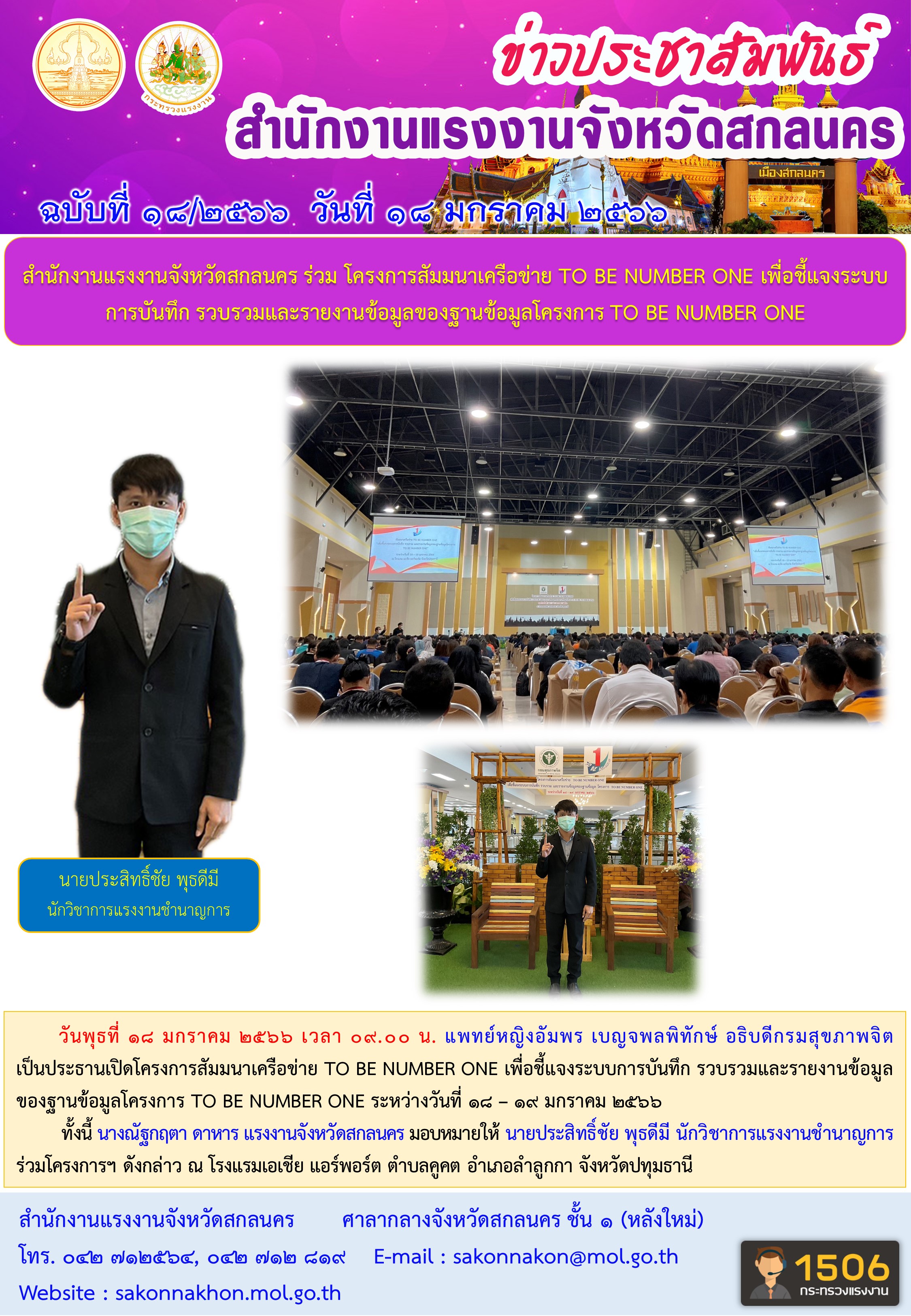 สำนักงานแรงงานจังหวัดสกลนคร ร่วมโครงการสัมมนาเครือข่าย TO BE NUMBER ONE เพื่อชี้แจงระบบการบันทึก รวบรวมและรายงานข้อมูลของฐานข้อมูลโครงการ TO BE NUMBER ONE