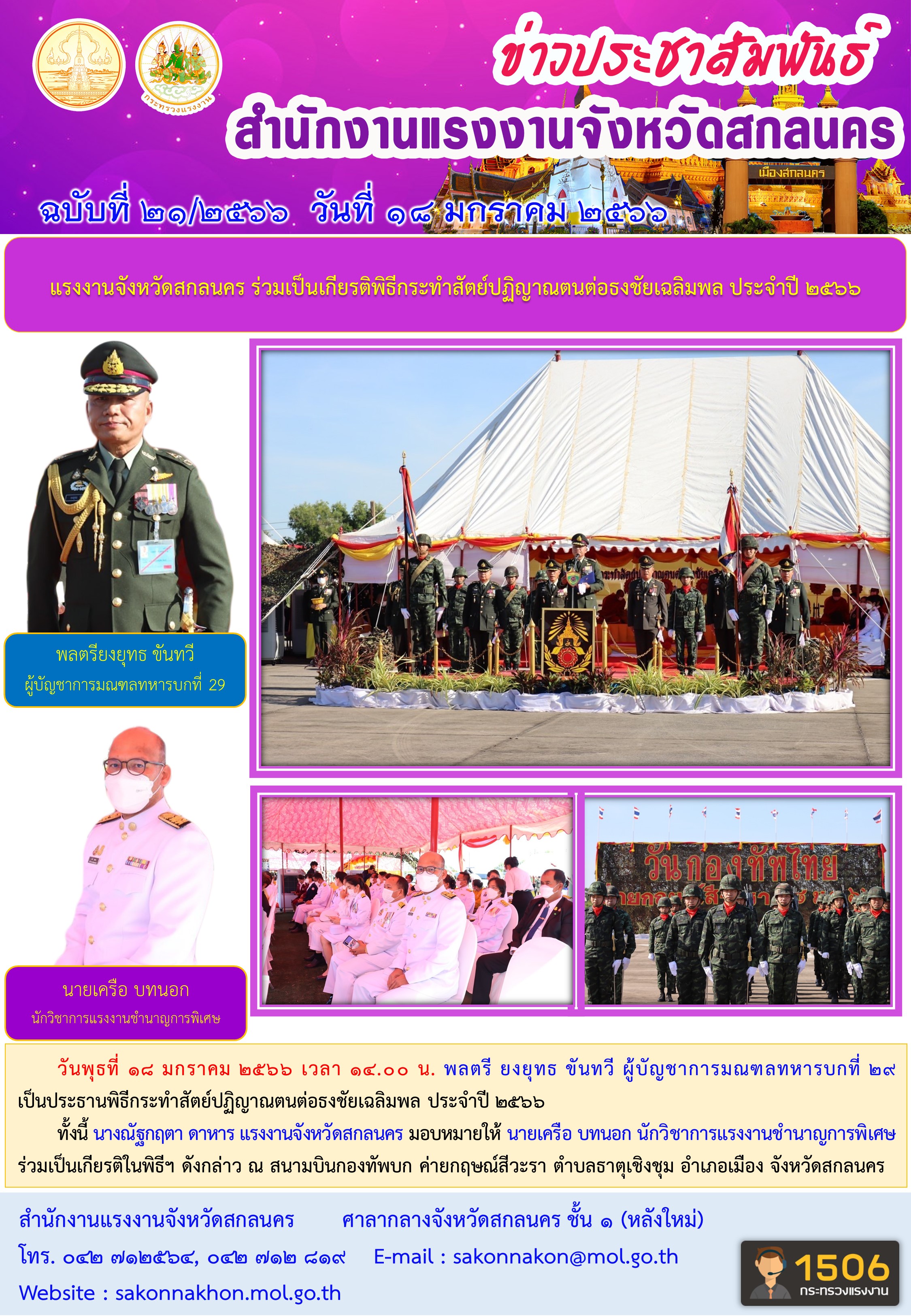 สำนักงานแรงงานจังหวัดสกลนคร ร่วมเป็นเกียรติพิธีกระทำสัตย์ปฏิญาณตนต่อธงชัยเฉลิมพล ประจำปี 2566