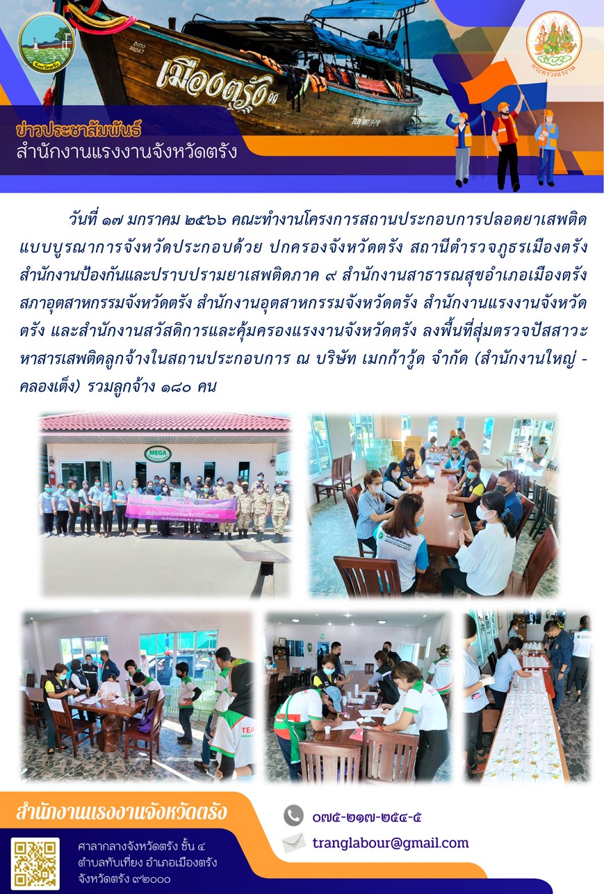 สรจ.ตรัง คณะทำงานโครงการสถานประกอบการปลอดยาเสพติดแบบบูรณาการจังหวัดตรัง ลงพื้นที่สุ่มตรวจปัสสาวะหาสารเสพติดลูกจ้างในสถานประกอบการ ณ บริษัท เมกก้าวู้ด จำกัด (สำนักงานใหญ่-คลองเต็ง)