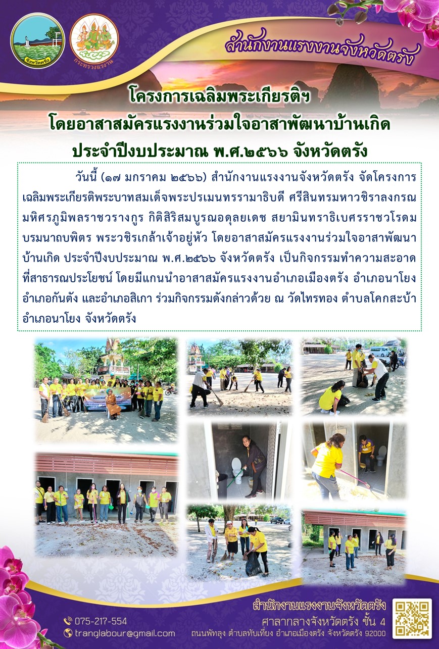 สรจ.ตรัง จัดโครงการเฉลิมพระเกียรติฯ โดยอาสาสมัครแรงงานร่วมใจอาสาพัฒนาบ้านเกิด ประจำปีงบประมาณ พ.ศ.2566 จังหวัดตรัง