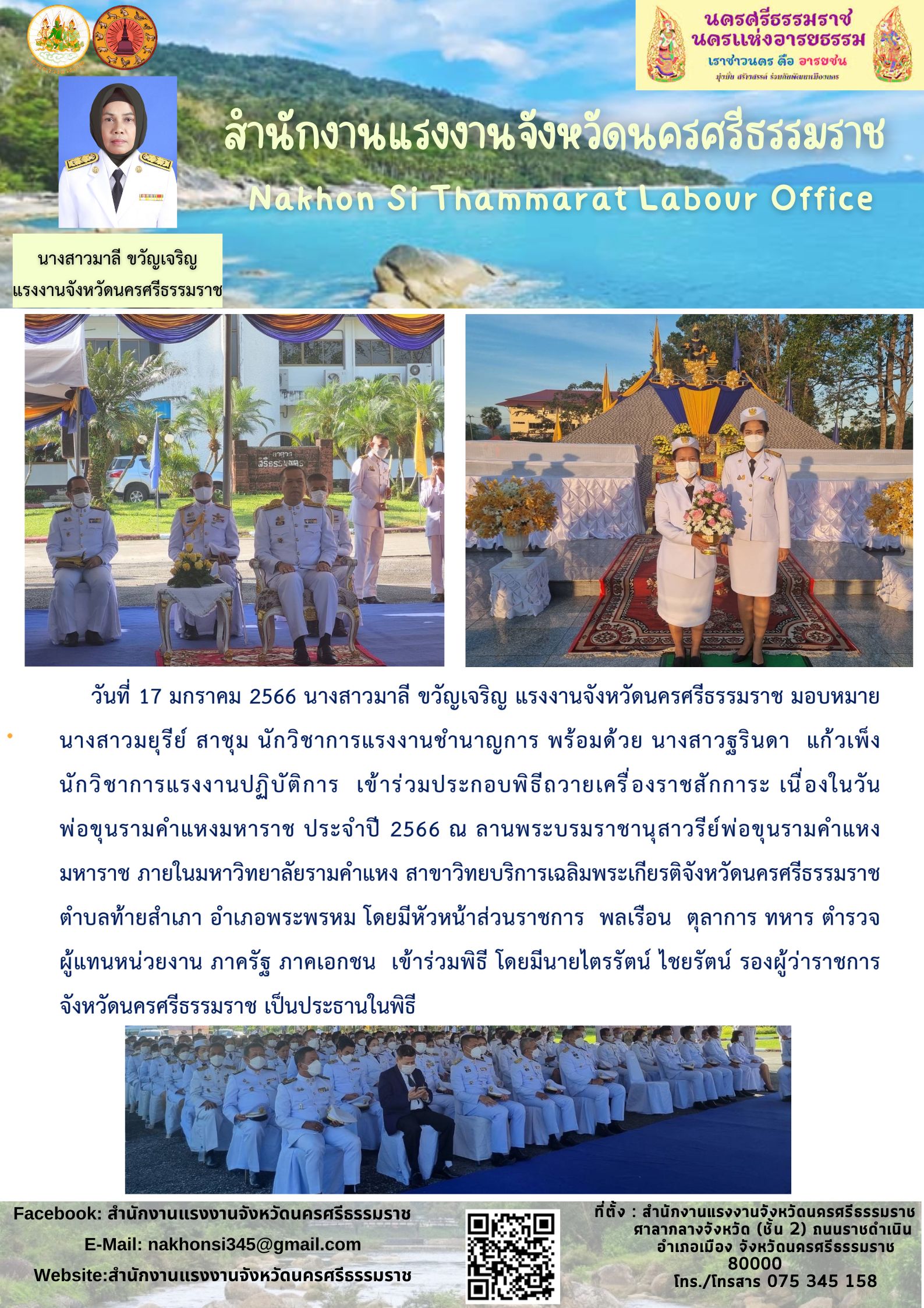 สรจ.นครศรีธรรมราช เข้าร่วมประกอบพิธีถวายเครื่องราชสักการะ เนื่องในวันพ่อขุนรามคำแหงมหาราช ประจำปี 2566 โดยมีนายไตรรัตน์ ไชยรัตน์ รองผู้ว่าราชการจังหวัดนครศรีธรรมราช เป็นประธานในพิธี