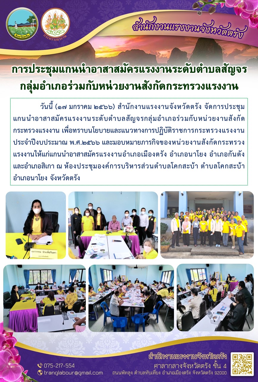 สำนักงานแรงงานจังหวัดตรัง จัดการประชุมแกนนำอาสาสมัครแรงงานระดับตำบลสัญจรกลุ่มอำเภอร่วมกับหน่วยงานสังกัดกระทรวงแรงงาน (อาสาสมัครแรงงานอำเภอเมืองตรัง อำเภอนาโยง อำเภอกันตัง และอำเภอสิเกา)