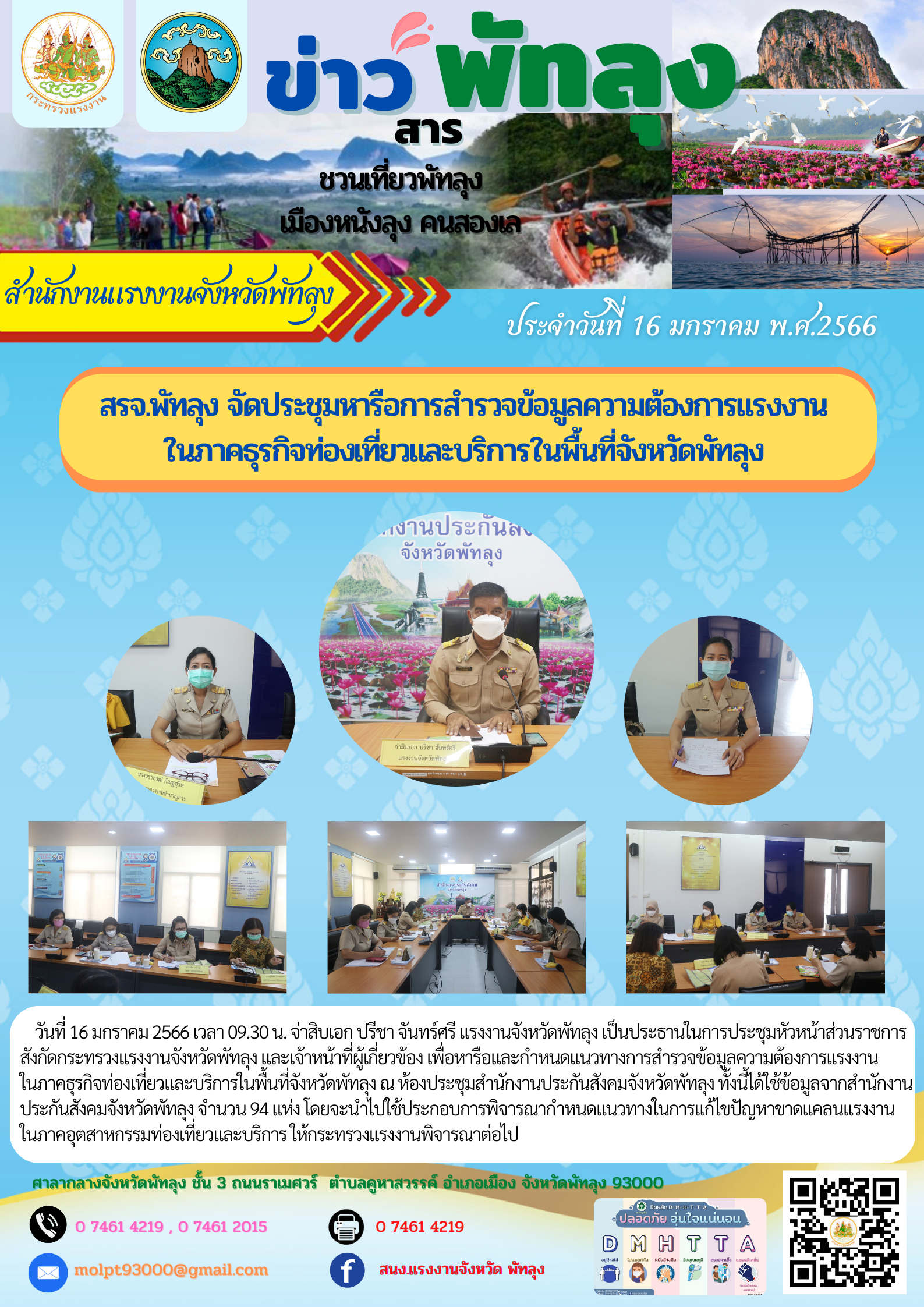 สรจ.พัทลุง จัดประชุมหารือการสำรวจข้อมูลความต้องการแรงงาน ในภาคธุรกิจท่องเที่ยวและบริการในพื้นที่จังหวัดพัทลุง
