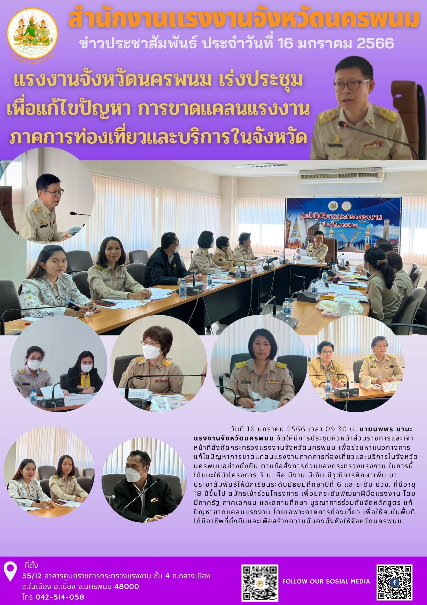 แรงงานจังหวัดนครพนม เร่งประชุม เพื่อแก้ไขปัญหา การขาดแคลนแรงงานภาคการท่องเที่ยวและบริการในจังหวัด