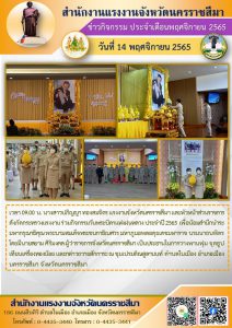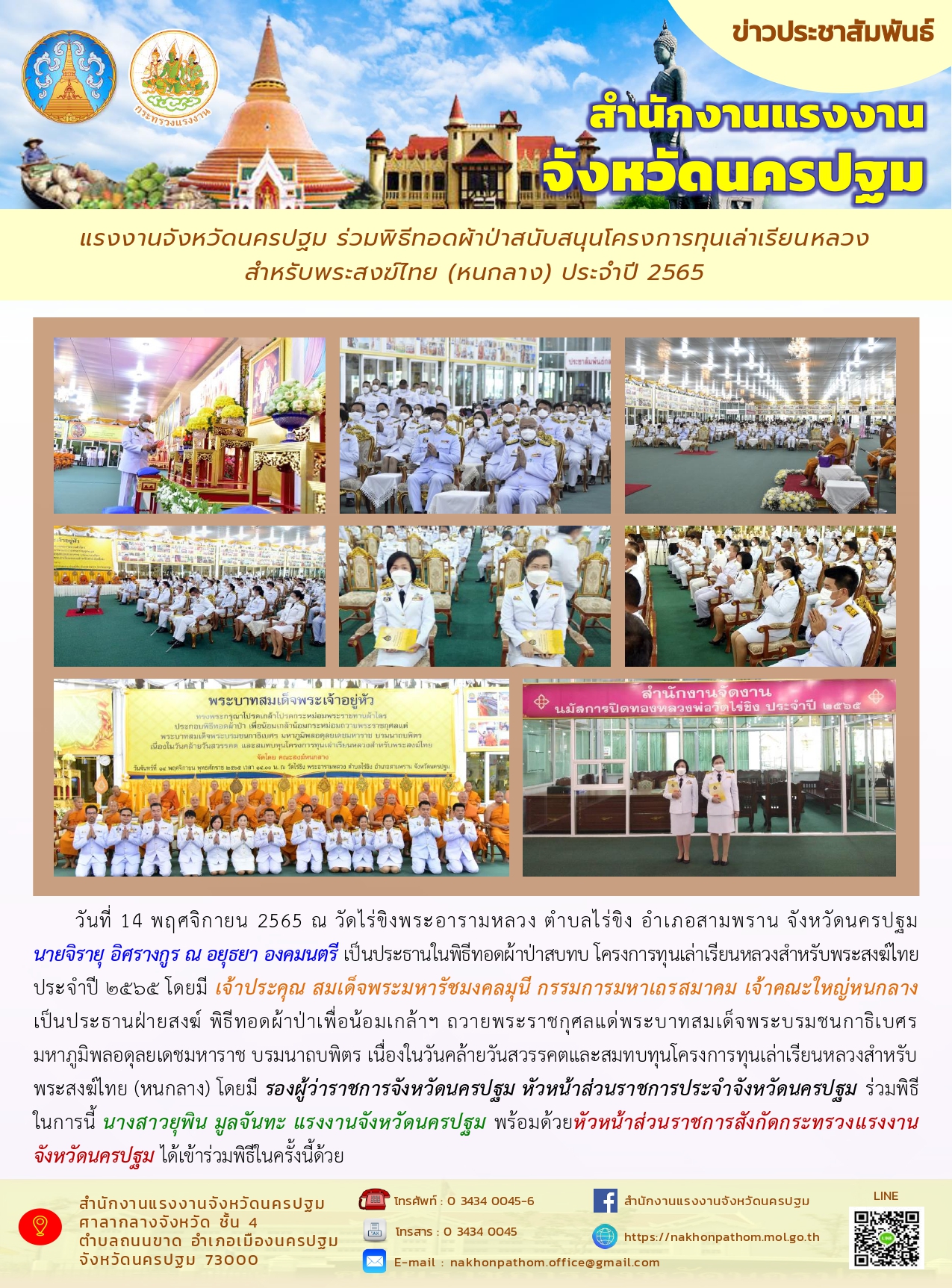 แรงงานจังหวัดนครปฐม ร่วมพิธีทอดผ้าป่าสนับสนุนโครงการทุนเล่าเรียนหลวงสำหรับพระสงฆ์ไทย (หนกลาง) ประจำปี 2565