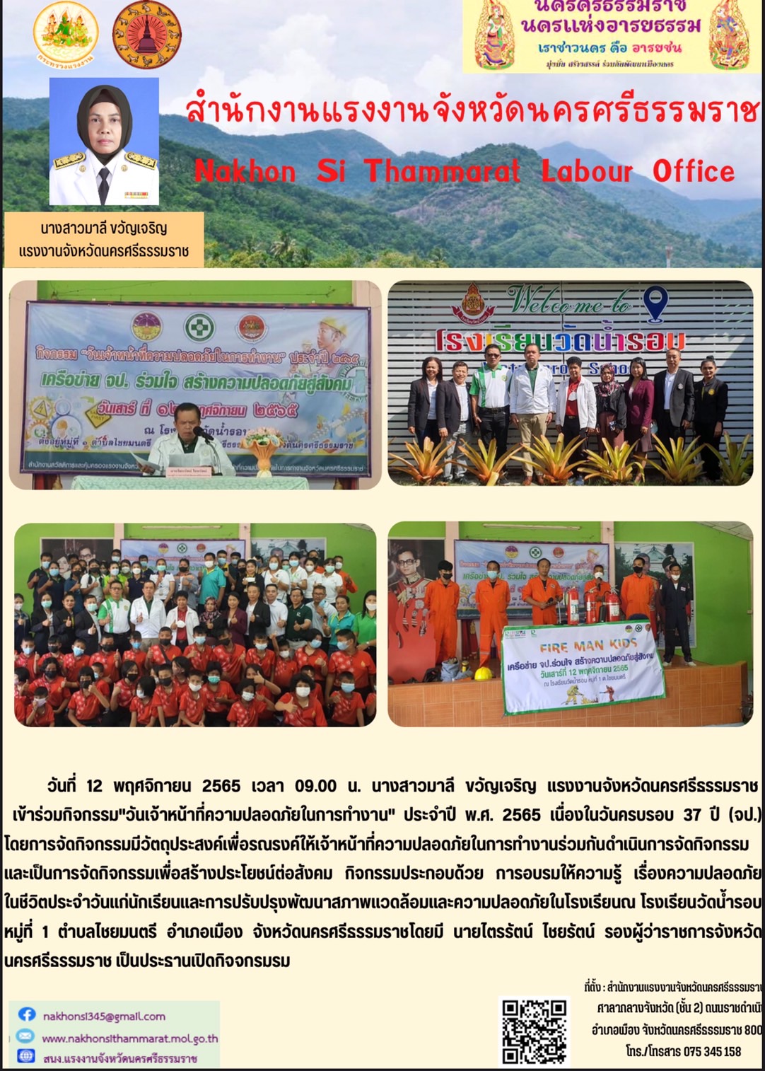 วันที่ 12 พฤศจิกายน 2565 เวลา 09.00 น. นางสาวมาลี ขวัญเจริญ แรงงานจังหวัดนครศรีธรรมราช เข้าร่วมกิจกรรม”วันเจ้าหน้าที่ความปลอดภัยในการทำงาน” ประจำปี พ.ศ. 2565 ณ โรงเรียนวัดน้ำรอบ หมู่ที่ 1 ตำบลไชยมนตรี อำเภอเมือง จังหวัดนครศรีธรรมราช โดยมี นายไตรรัตน์ ไชยรัตน์ รองผู้ว่าราชการจังหวัดนครศรีธรรมราช เป็นประธานเปิดกิจกรรม