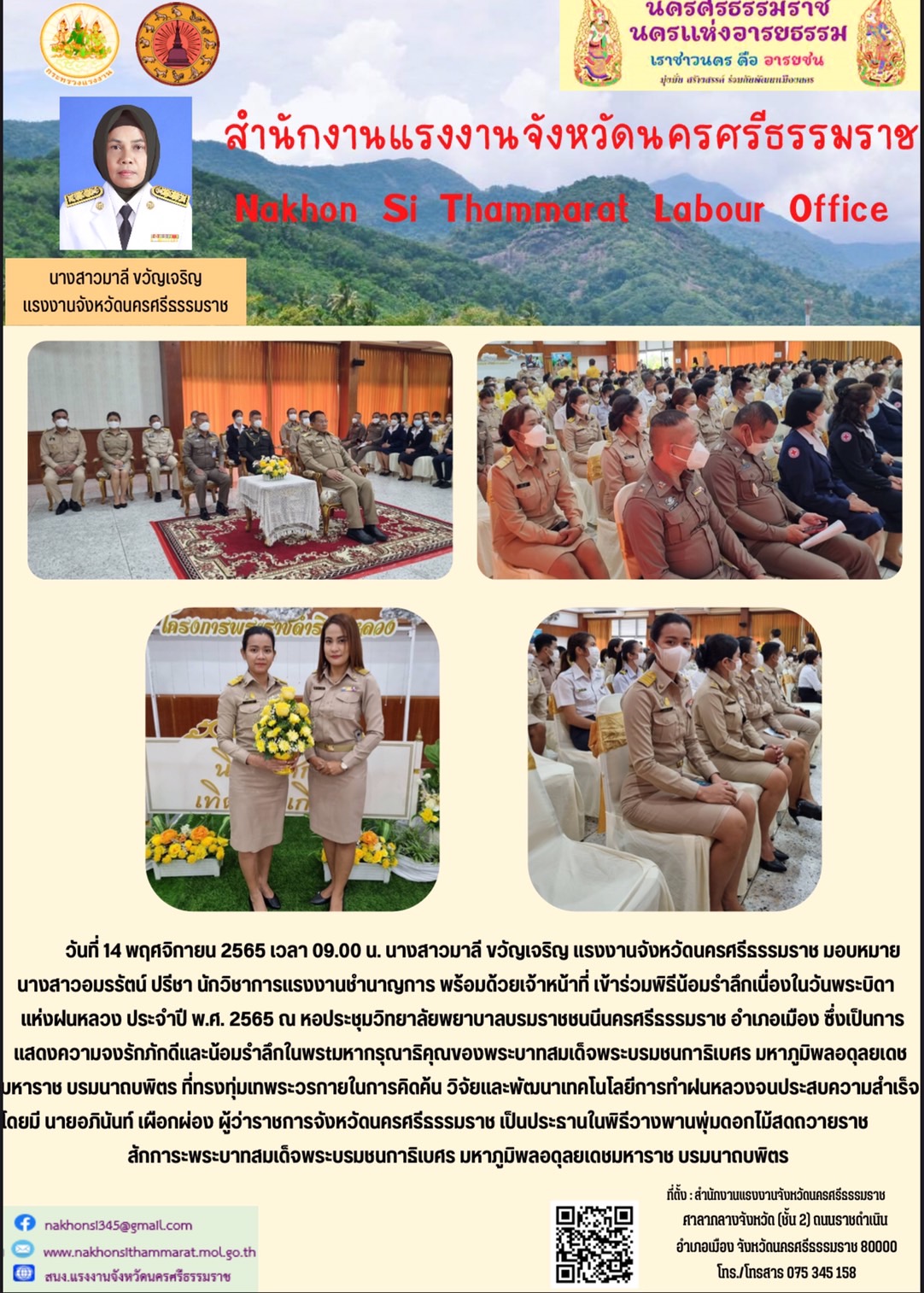 วันที่ 14 พฤศจิกายน 2565 เวลา 09.00 น. นางสาวมาลี ขวัญเจริญ แรงงานจังหวัดนครศรีธรรมราช มอบหมาย นางสาวอมรรัตน์ ปรีชา นักวิชาการแรงงานชำนาญการ พร้อมด้วยเจ้าหน้าที่ เข้าร่วมพิธีน้อมรำลึกเนื่องในวันพระบิดา แห่งฝนหลวง ประจำปี พ.ศ. 2565 ณ หอประชุมวิทยาลัยพยาบาลบรมราชชนนีนครศรีธรรมราชอำเภอเมืองนครศรีธรรมราช
