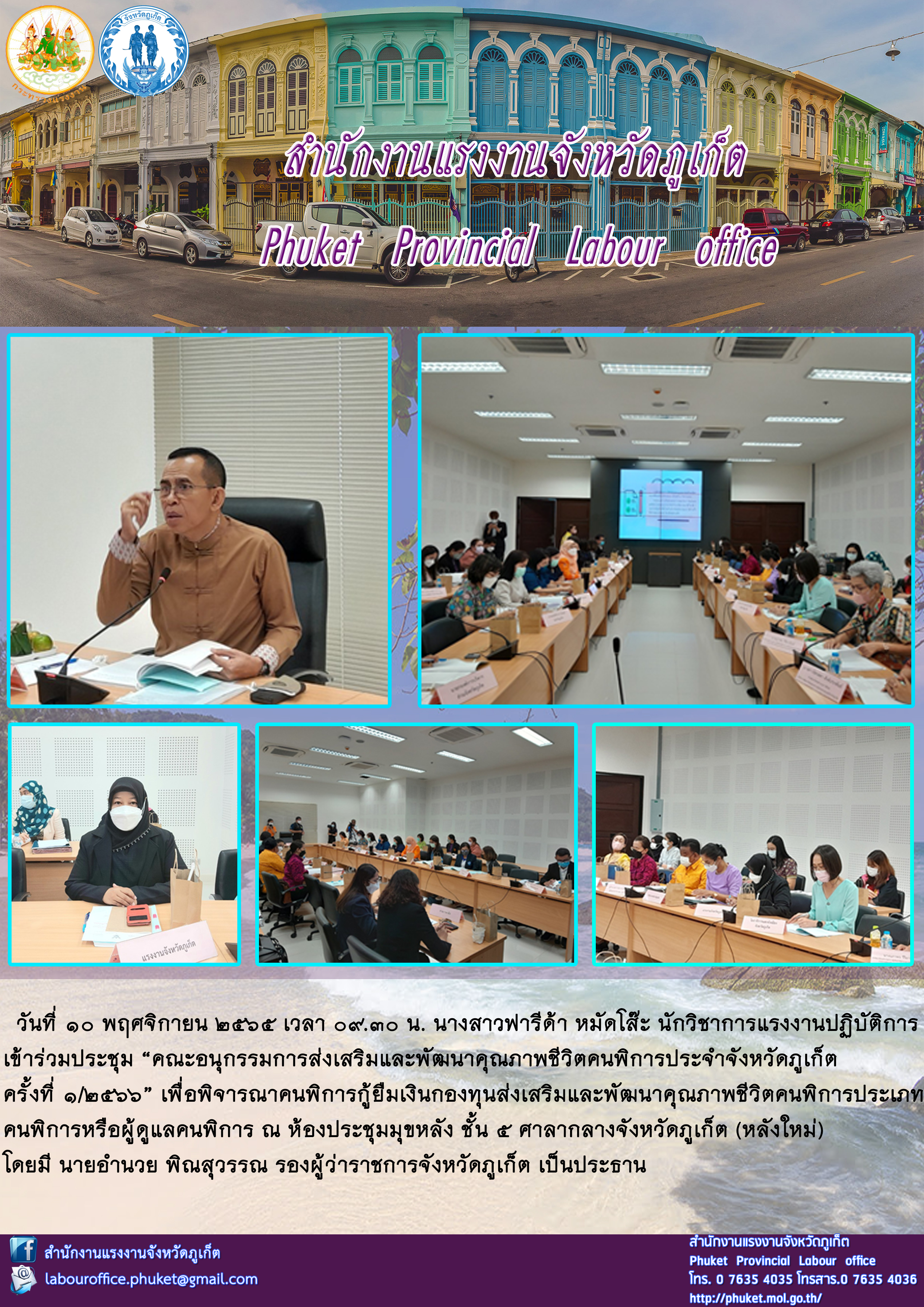 วันที่ 10 พฤศจิกายน 2565 เวลา 09.30 น. นางสาวฟารีด้า หมัดโส๊ะ นักวิชาการแรงงานปฏิบัติการ เข้าร่วมประชุม “คณะอนุกรรมการส่งเสริมและพัฒนาคุณภาพชีวิตคนพิการประจำจังหวัดภูเก็ต ครั้งที่ 1/2566”