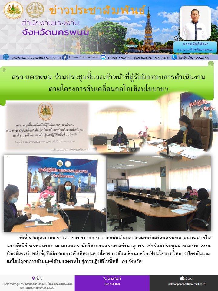 สรจ.ตาก ร่วมประชุมชี้แจงเจ้าหน้าที่ผู้รับผิดชอบการดำเนินงานตามโครงการขับเคลื่อนกลไกเชิงนโยบายในการป้องกันและแก้ไขปัญหาการค้ามนุษย์ด้านแรงงานไปสู่การปฏิบัติในพื้นที่ทั้ง 76 จังหวัด