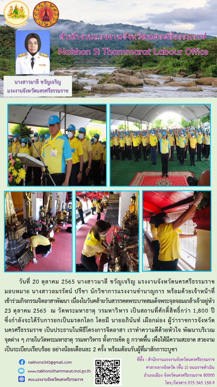 วันที่ 20 ตุลาคม 2565 นางสาวมาลี ขวัญเจริญ แรงงานจังหวัดนครศรีธรรมราช มอบหมาย นางสาวอมรรัตน์ ปรีชา นักวิชาการแรงงานชำนาญการ พร้อมด้วยเจ้าหน้าที่ เข้าร่วมกิจกรรมจิตอาสาพัฒนา เนื่องในวันคล้ายวันสวรรคตพระบาทสมเด็จพระจุลจอมเกล้าเจ้าอยู่หัว 23 ตุลาคม 2565 ณ วัดพระมหาธาตุ วรมหาวิหาร โดยมี นายอภินันท์ เผือกผ่อง ผู้ว่าราชการจังหวัดนครศรีธรรมราช เป็นประธานในพิธีโครงการจิตอาสา เราทำความดีด้วยหัวใจ