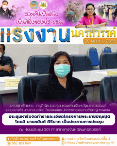 แรงงานจังหวัดนครสวรรค์ มอบหมายให้ นางสาวนวรัตน์ ไชยรัตนฉัตร นักวิชาการแรงงานชำนาญการพิเศษ เข้าร่วมประชุมหารือจัดทำรายละเอียดโครงการพระราชบัญญัติ โดยมี นายชยันต์ ศิริมาศ เป็นประธานการประชุม