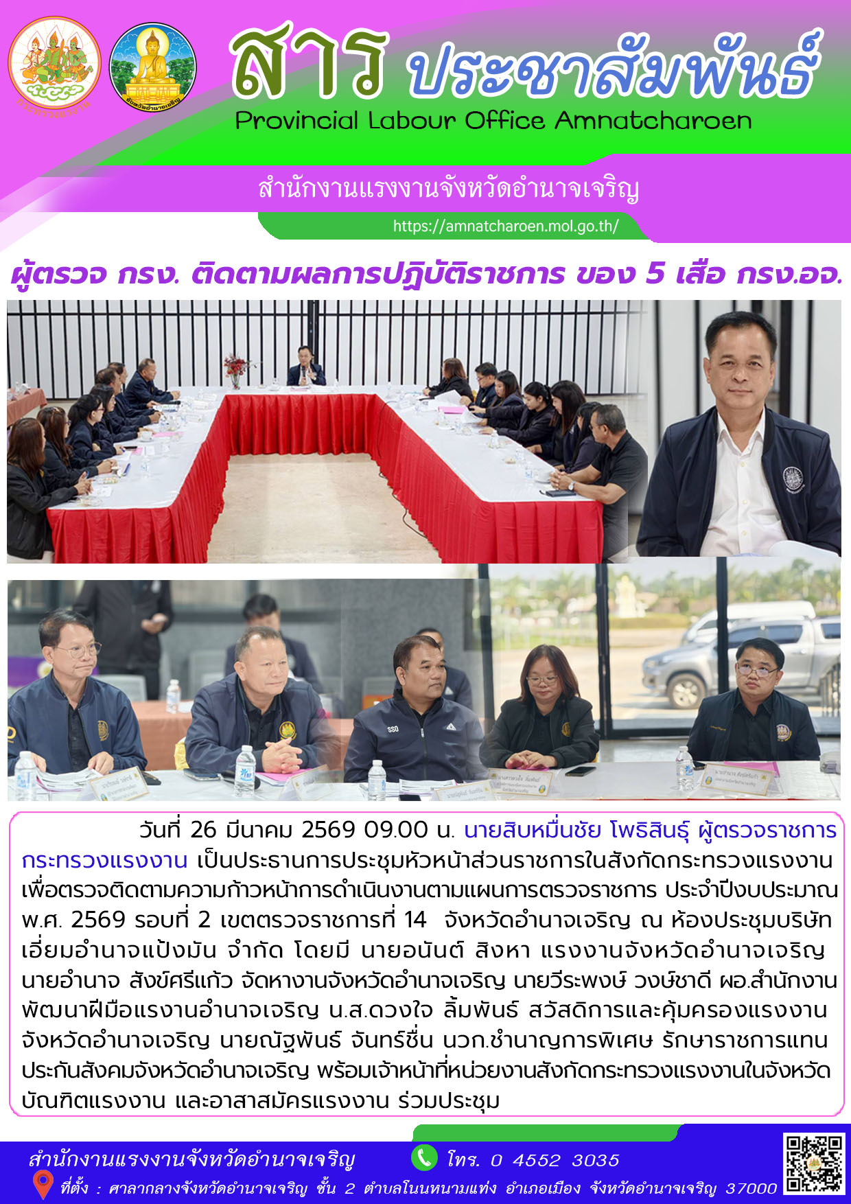 สำนักงานแรงงานจังหวัดกำแพงเพชร จัดประชุมหัวหน้าส่วนราชการสังกัดกระทรวงแรงงาน และการประชุมคณะกรรมการศูนย์ปฏิบัติการป้องกันการค้ามนุษย์ด้านแรงงาน จังหวัดกำแพงเพชร ประจำเดือนมีนาคม 2569
