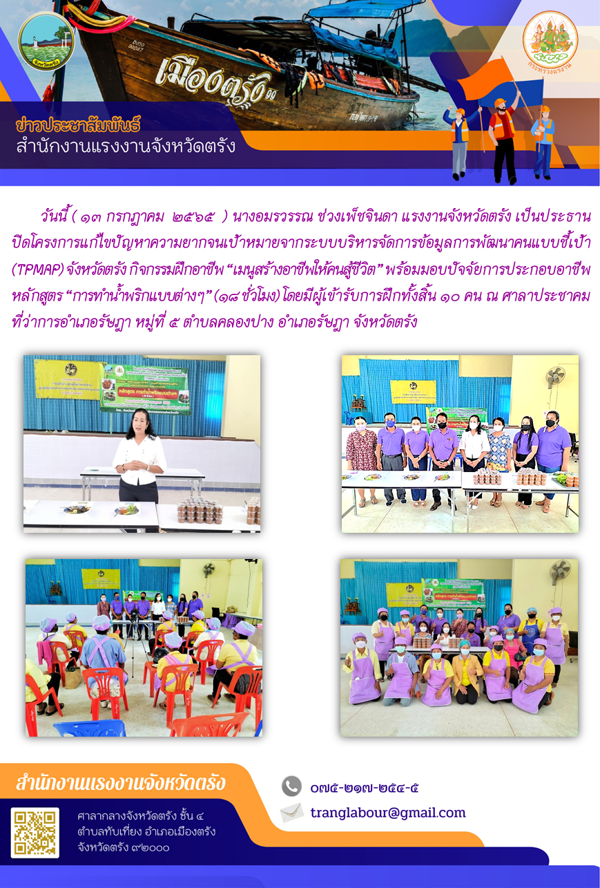 แรงงานจังหวัดตรัง เป็นประธานปิดโครงการแก้ไขปัญหาความยากจนเป้าหมายจากระบบบริหารจัดการข้อมูลการพัฒนาคนแบบชี้เป้า (TPMAP) จังหวัดตรัง กิจกรรมฝึกอาชีพ “เมนูสร้างอาชีพให้คนสู้ชีวิต” พร้อมมอบปัจจัยการประกอบอาชีพ หลักสูตร “การทำน้ำพริกแบบต่างๆ”