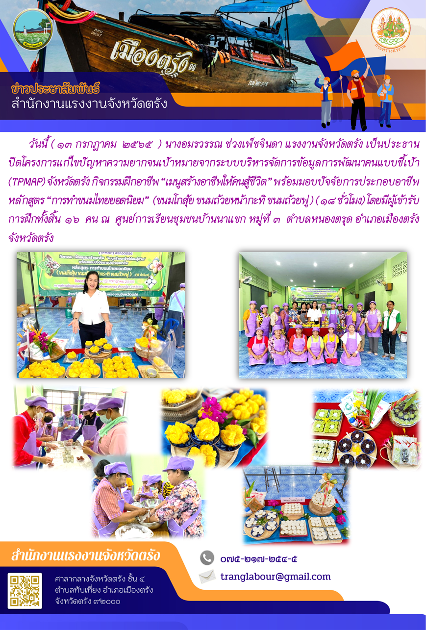 แรงงานจังหวัดตรัง เป็นประธานปิดโครงการแก้ไขปัญหาความยากจนเป้าหมายจากระบบบริหารจัดการข้อมูลการพัฒนาคนแบบชี้เป้า (TPMAP) จังหวัดตรัง กิจกรรมฝึกอาชีพ “เมนูสร้างอาชีพให้คนสู้ชีวิต” พร้อมมอบปัจจัยการประกอบอาชีพ หลักสูตร “การทำขนมไทยยอดนิยม” (ขนมโกสุ้ย ขนมถ้วยหน้ากะทิ ขนมถ้วยฟู )