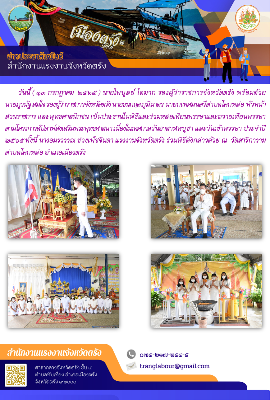 แรงงานจังหวัดตรัง ร่วมพิธีและร่วมหล่อเทียนพรรษาและถวายเทียนพรรษา ตามโครงการสัปดาห์ส่งเสริมพระพุทธศาสนา เนื่องในเทศกาลวันอาสาฬหบูชา และวันเข้าพรรษา ประจำปี 2565