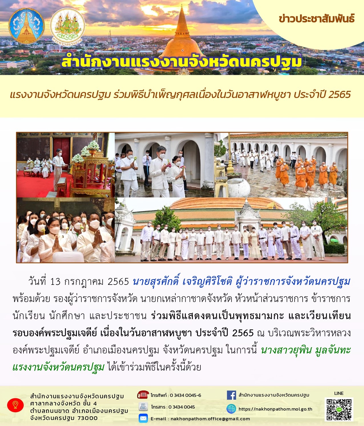 แรงงานจังหวัดนครปฐม ร่วมพิธีบำเพ็ญกุศลเนื่องในวันอาสาฬหบูชา ประจำปี 2565