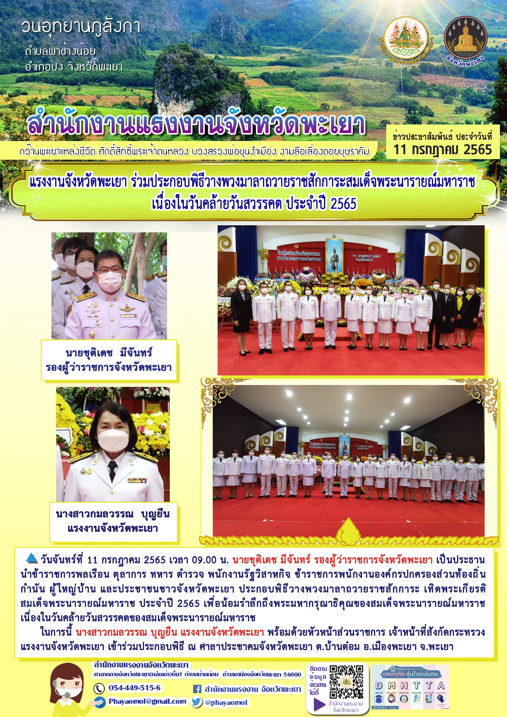 แรงงานจังหวัดพะเยา ร่วมประกอบพิธีวางพวงมาลาถวายราชสักการะสมเด็จพระนารายณ์มหาราช เนื่องในวันคล้ายวันสวรรคต ประจำปี 2565