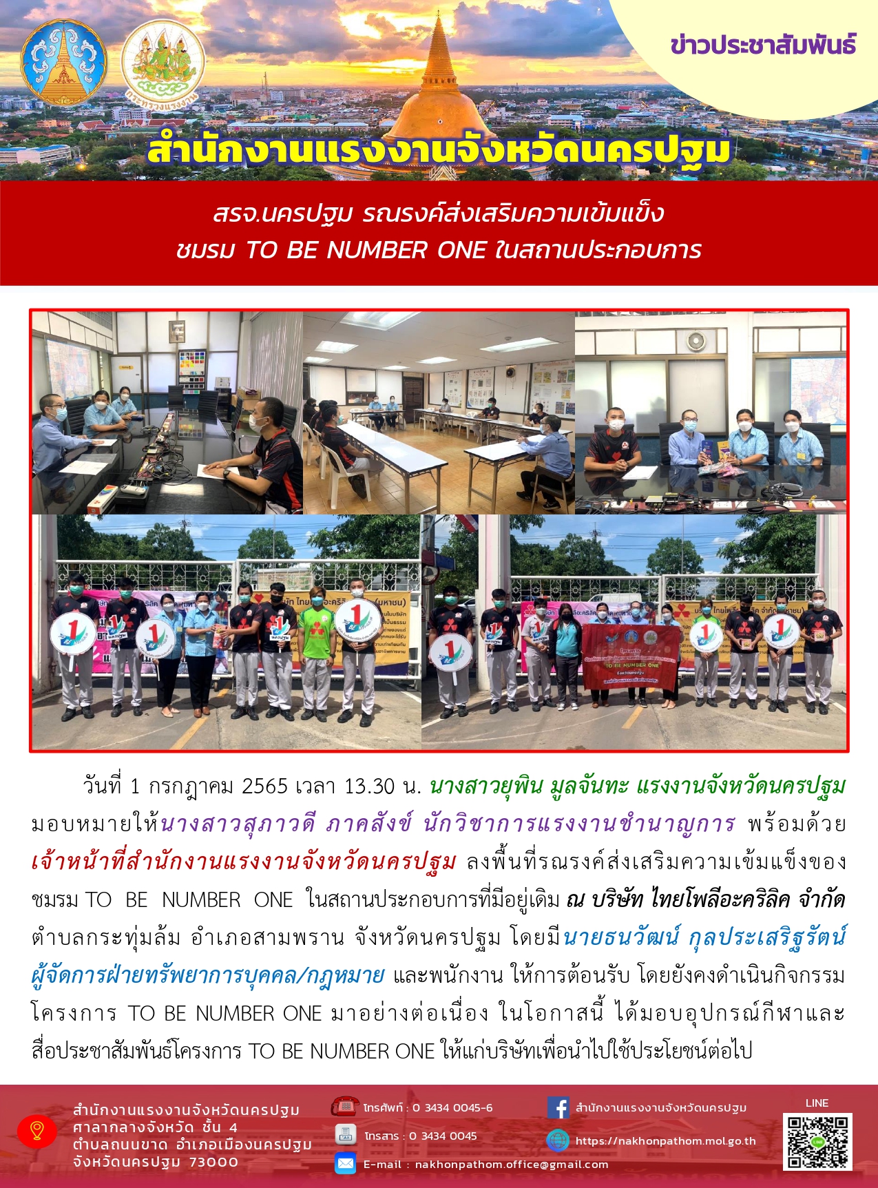 สรจ.นครปฐม รณรงค์ส่งเสริมความเข้มแข็งชมรม TO BE NUMBER ONE ในสถานประกอบการ