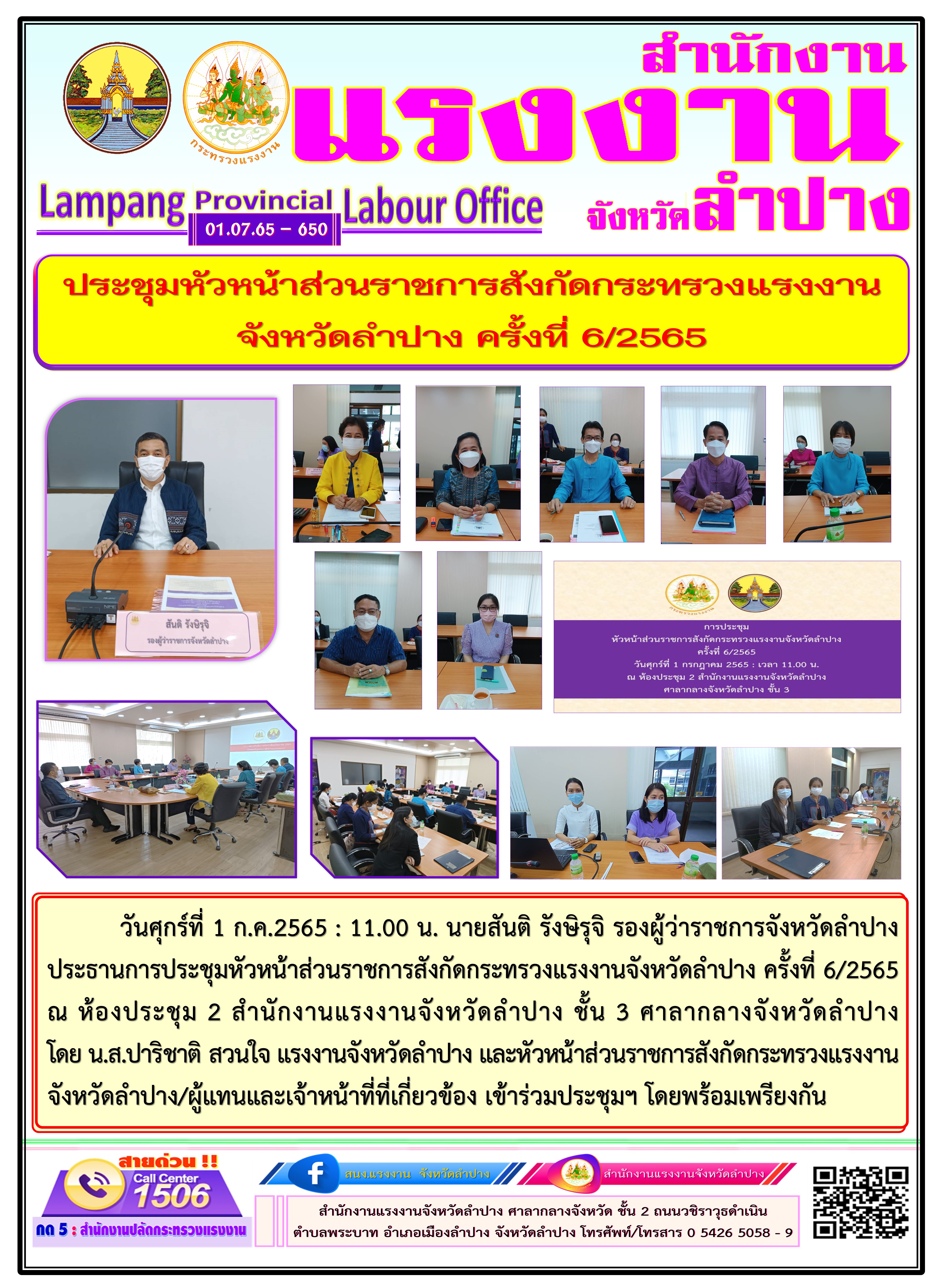 การประชุมหัวหน้าส่วนราชการสังกัดกระทรวงแรงงาน จังหวัดลำปาง ครั้งที่ 6/2565