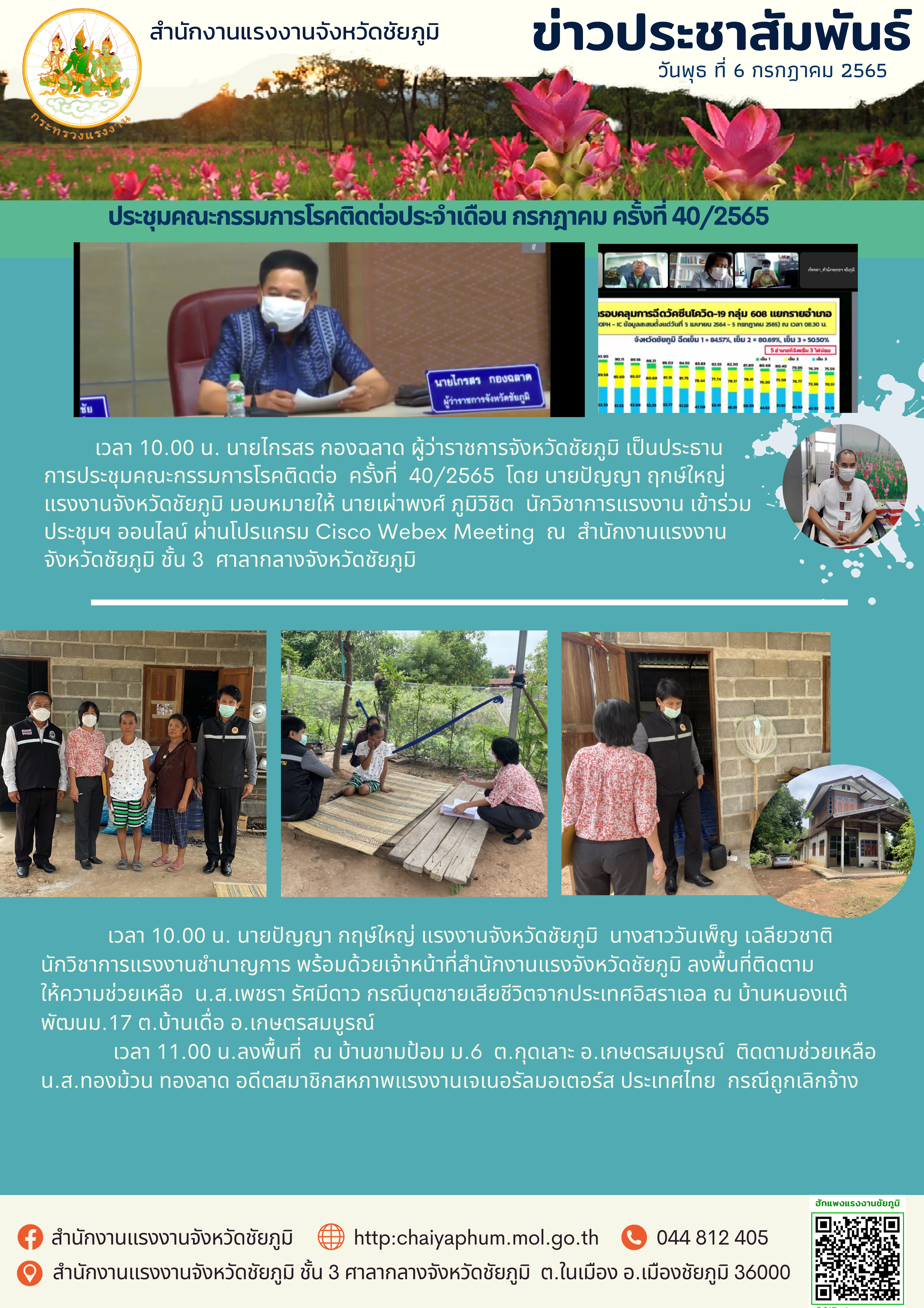 สรจ.ชัยภูมิ ร่วมประชุมคณะกรรมการโรคติดต่อฯ/ลงพื้นที่ติดตามให้ความช่วยเหลือ น.ส.เพชรา รัศมีดาว กรณีบุตรชายเสียชีวิตจากประเทศอิสราเอล และติดตามช่วยเหลือ น.ส.ทองม้วน ทองลาด อดีตสมาชิกสหภาพแรงงานเจเนอรัลมอเตอร์ส ประเทศไทย กรณีถูกเลิกจ้าง