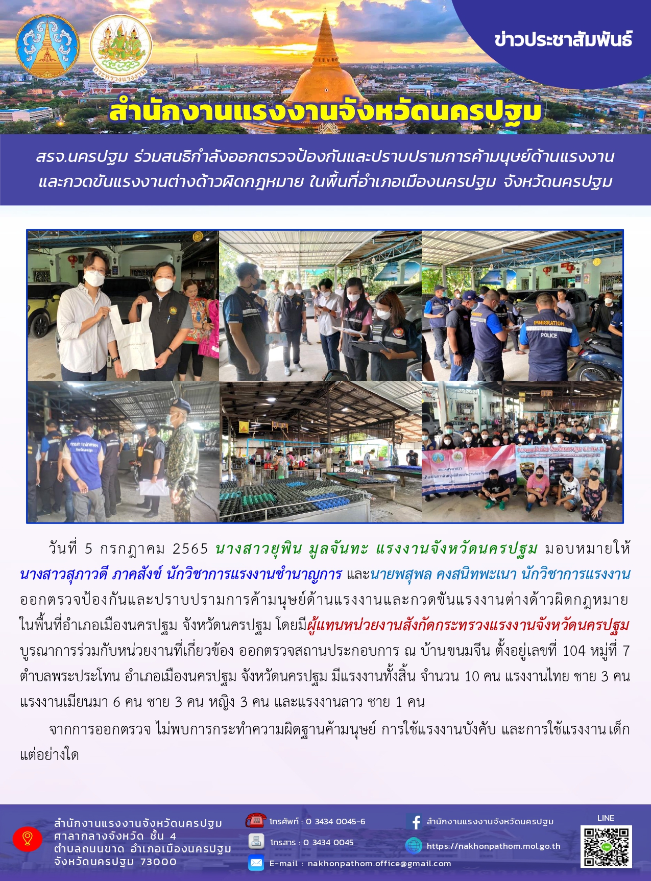 สรจ.นครปฐม ร่วมสนธิกำลังออกตรวจป้องกันและปราบปรามการค้ามนุษย์ด้านแรงงานและกวดขันแรงงานต่างด้าวผิดกฎหมาย ในพื้นที่อำเภอเมืองนครปฐม จังหวัดนครปฐม