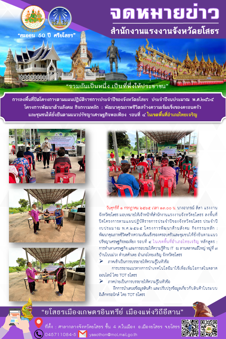 การลงพื้นที่ปิดโครงการตามแผนปฏิบัติราชการประจำปีของจังหวัดยโสธร ประจำปีงบประมาณ พ.ศ.๒๕๖๕ โครงการพัฒนาด้านสังคม กิจกรรมหลัก : พัฒนาคุณภาพชีวิตสร้างความเข้มแข็งของครอบครัวและชุมชนให้ยั่งยืนตามแนวปรัชญาเศรษฐกิจพอเพียง รอบที่ ๔ ในเขตพื้นที่อำเภอไทยเจริญ