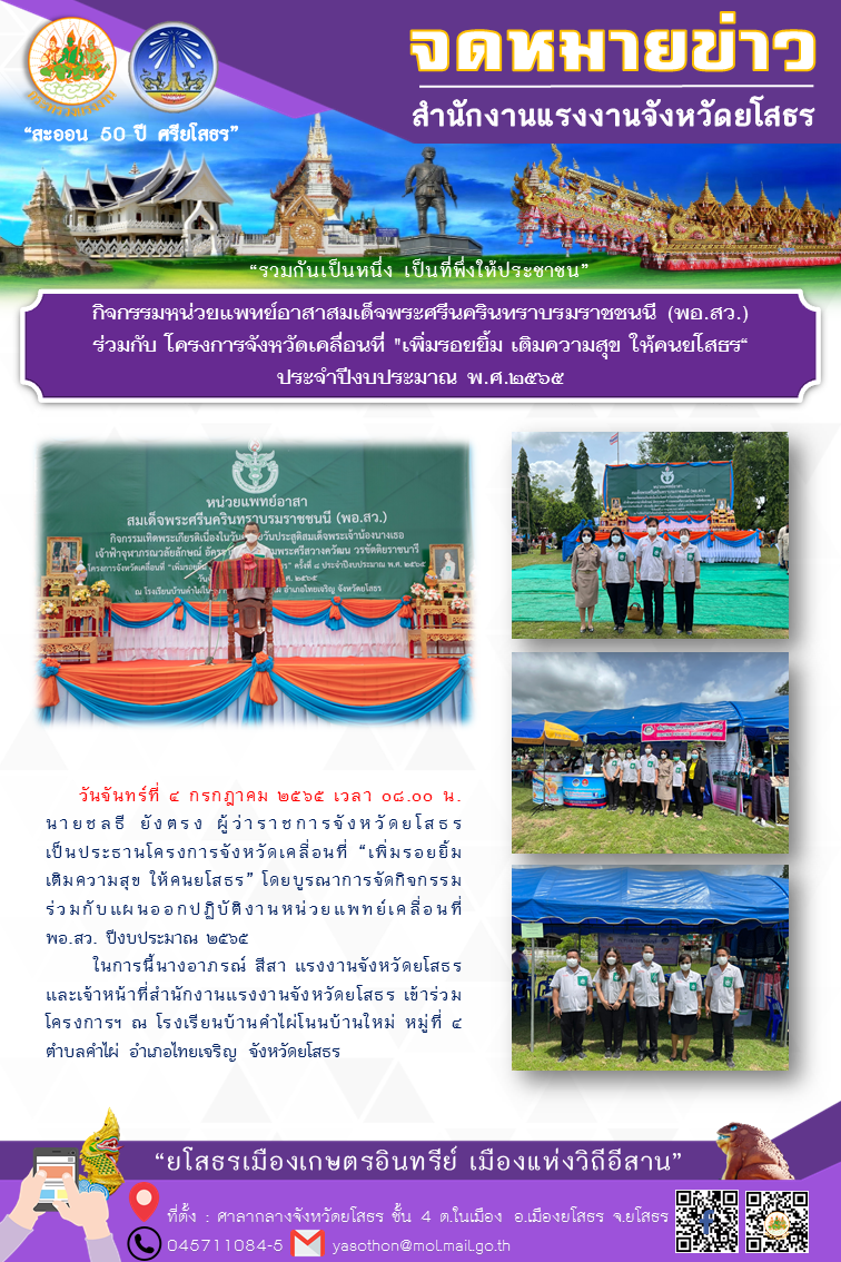 กิจกรรมหน่วยแพทย์อาสาสมเด็จพระศรีนครินทราบรมราชชนนี (พอ.สว.) ร่วมกับ โครงการจังหวัดเคลื่อนที่ “เพิ่มรอยยิ้ม เติมความสุข ให้คนยโสธร“ประจำปีงบประมาณ พ.ศ.๒๕๖๕