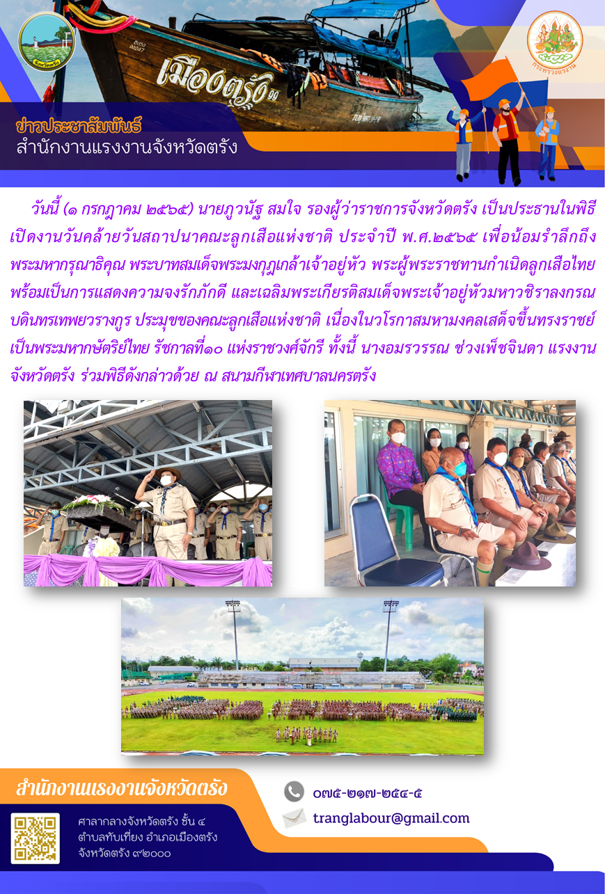 แรงงานจังหวัดตรัง ร่วมพิธีวันคล้ายวันสถาปนาคณะลูกเสือแห่งชาติ ประจำปี พ.ศ.2565