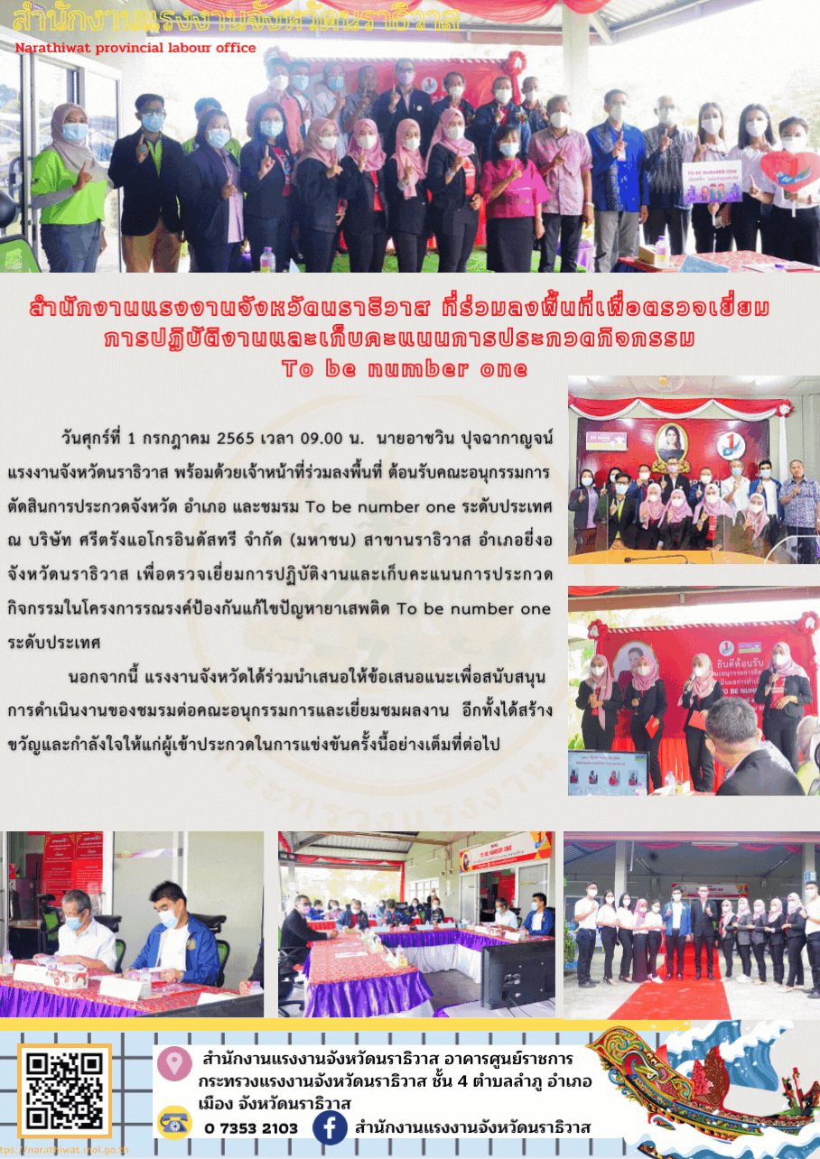 สำนักงานแรงงานจังหวัดนราธิวาส ที่ร่วมลงพื้นที่เพื่อตรวจเยี่ยมการปฏิบัติงานและเก็บคะแนนการประกวดกิจกรรม To be number one