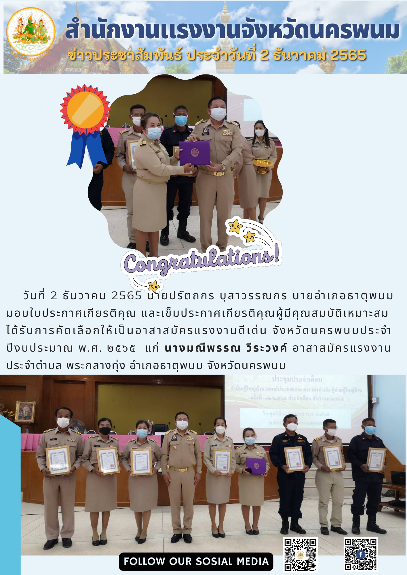 สรจ.นครพนม พิธีมอบใบประกาศเกียรติคุณและเข็มประกาศเกียรติคุณ แก่อาสาสมัครแรงงานดีเด่น จังหวัดนครพนม ประจำปีงบประมาณ พ.ศ.2565