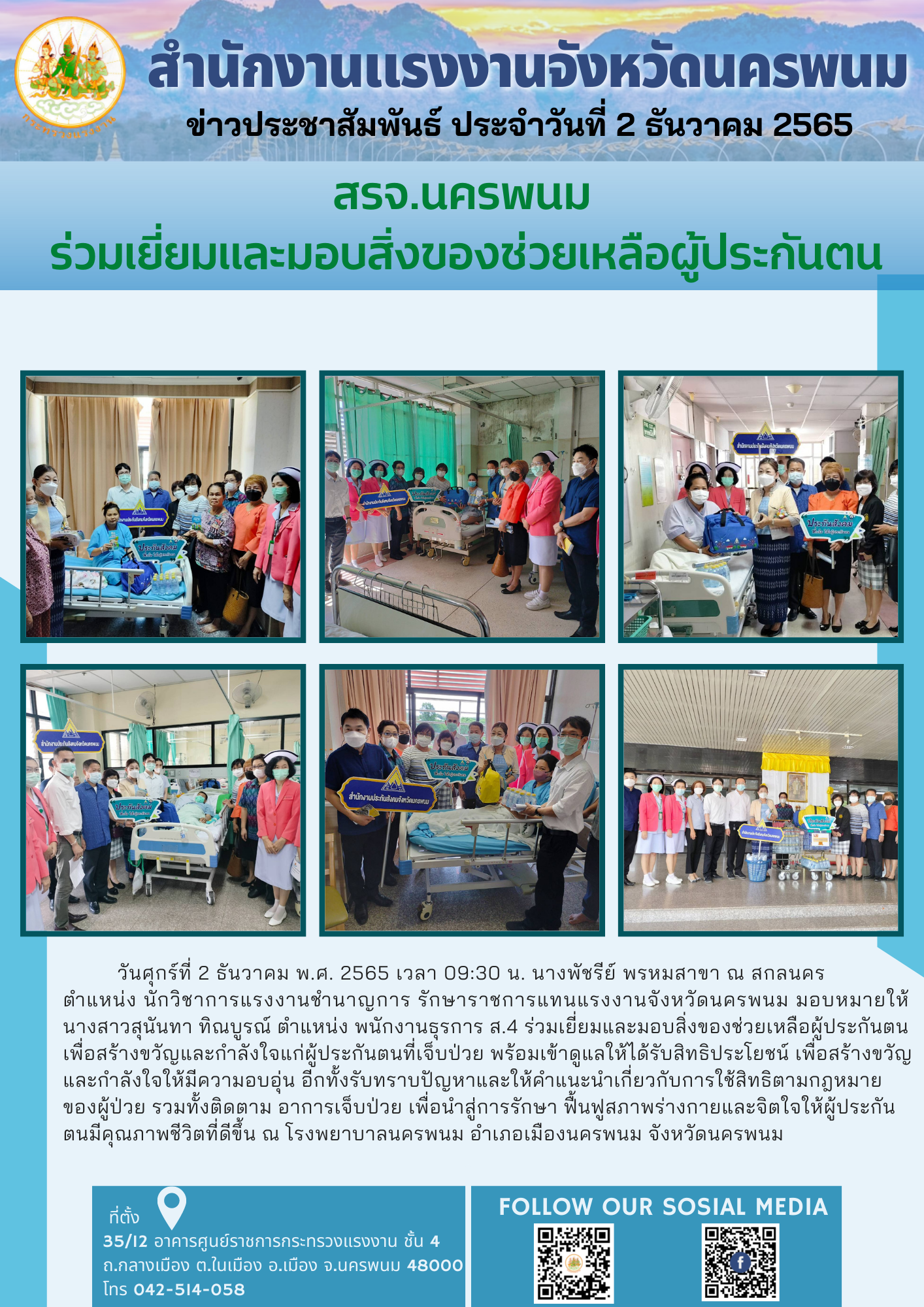 สรจ.นครพนม ร่วมเยี่ยมและมอบสิ่งของช่วยเหลือผู้ประกันตน เพื่อสร้างขวัญและกำลังใจแก่ผู้ประกันตนที่เจ็บป่วย