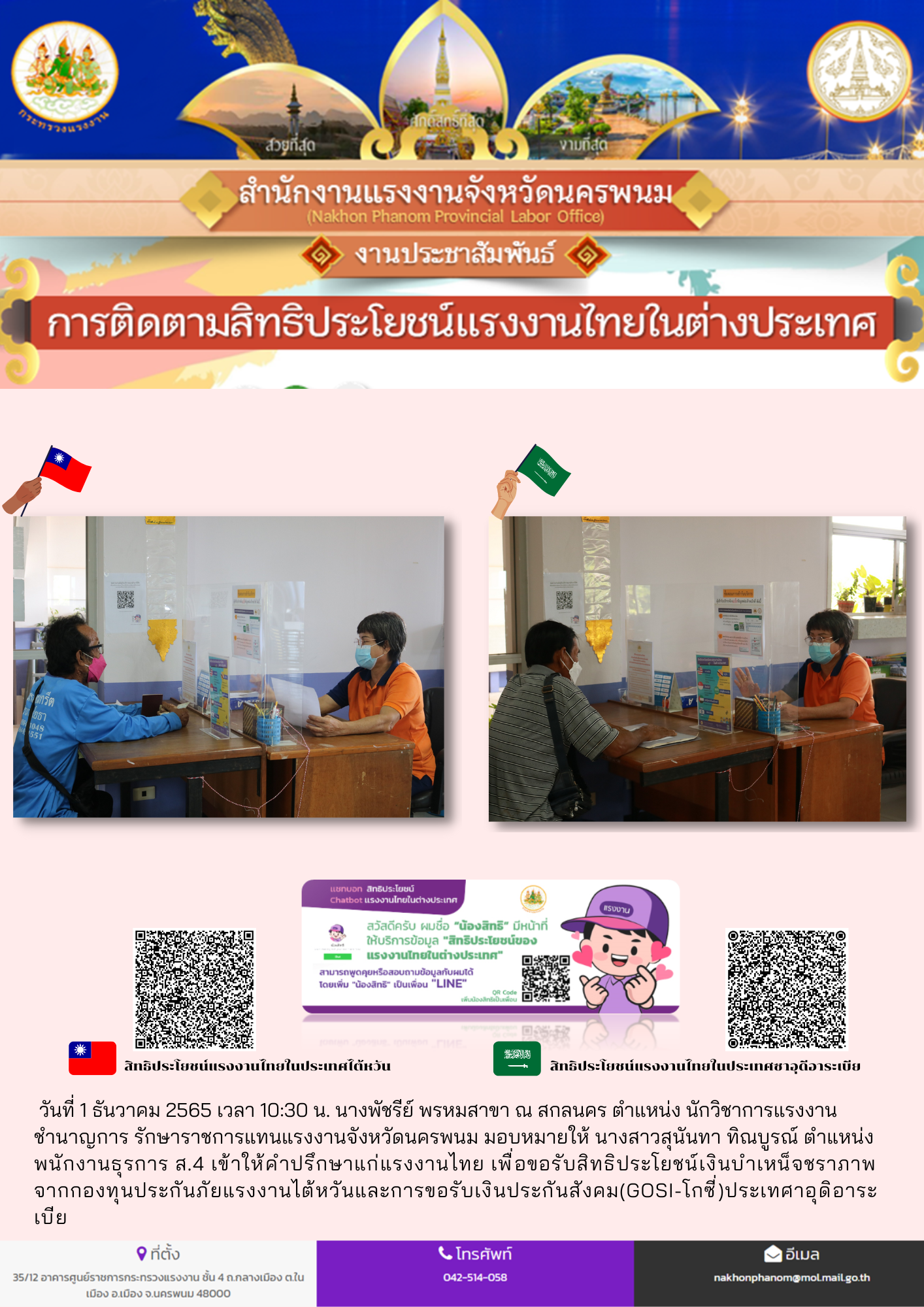 สรจ.นครพนม ให้คำปรึกษาเพื่อขอรับสิทธิประโยชน์เงินบำเหน็จชราภาพ จากกองทุนประกันภัยแรงงานไต้หวัน และการขอรับเงินประกันสังคม (GOSI-โกซี่) ประเทศซาอุดิอาระเบีย