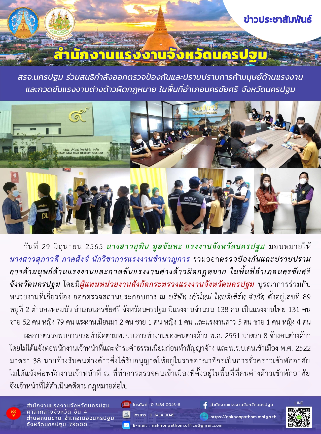 สรจ.นครปฐม ร่วมสนธิกำลังออกตรวจป้องกันและปราบปรามการค้ามนุษย์ด้านแรงงานและกวดขันแรงงานต่างด้าวผิดกฎหมาย ในพื้นที่อำเภอนครชัยศรี จังหวัดนครปฐม