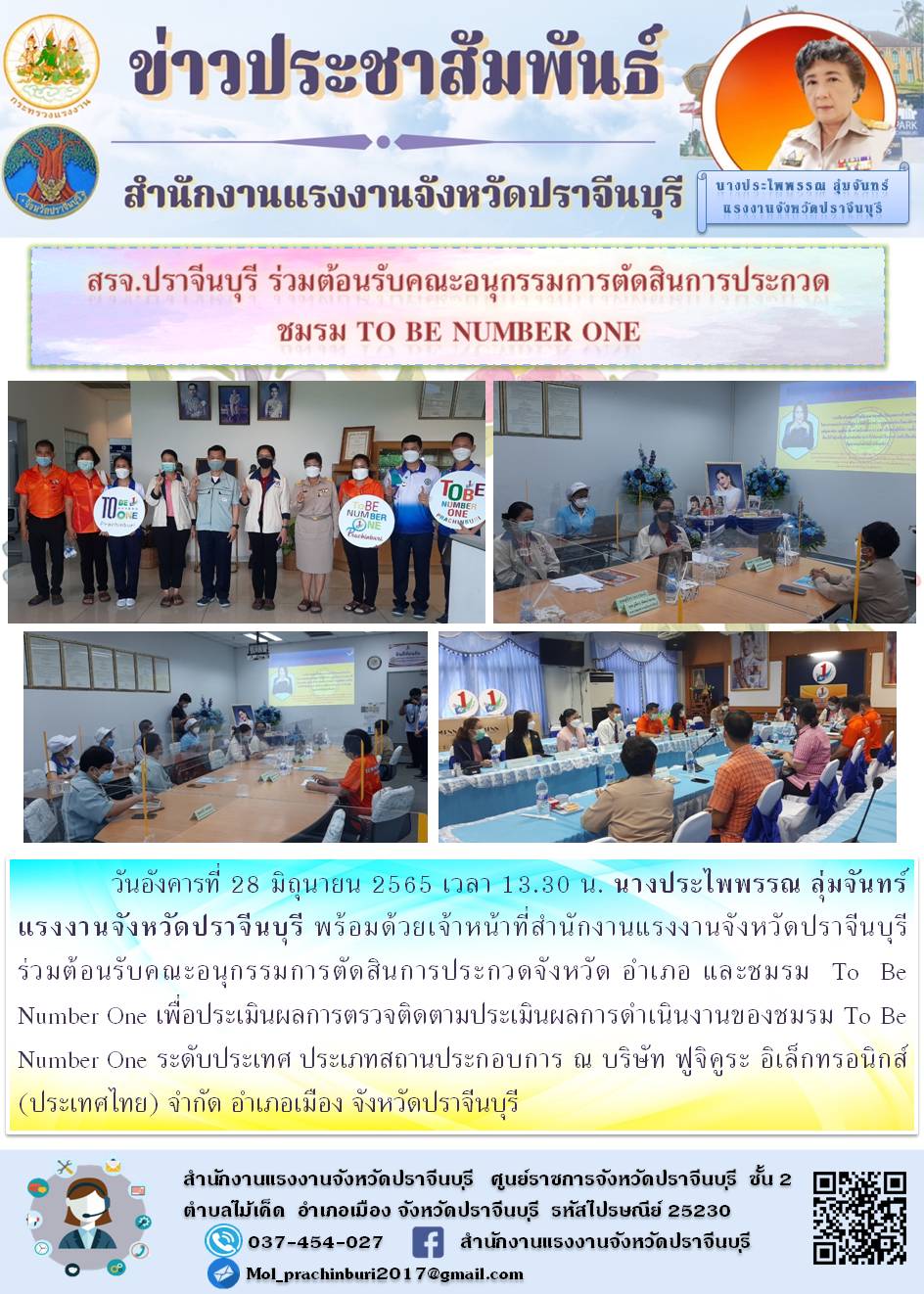 นางประไพพรรณ ลุ่มจันทร์ แรงงานจังหวัดปราจีนบุรี พร้อมด้วยเจ้าหน้าที่สำนักงานแรงงานจังหวัดปราจีนบุรี ประเมินผลการตรวจติดตามประเมินผลการดำเนินงานของชมรม To Be Number One ระดับประเทศ ประเภทสถานประกอบการ ณ บริษัท ฟูจิคูระ อิเล็กทรอนิกส์