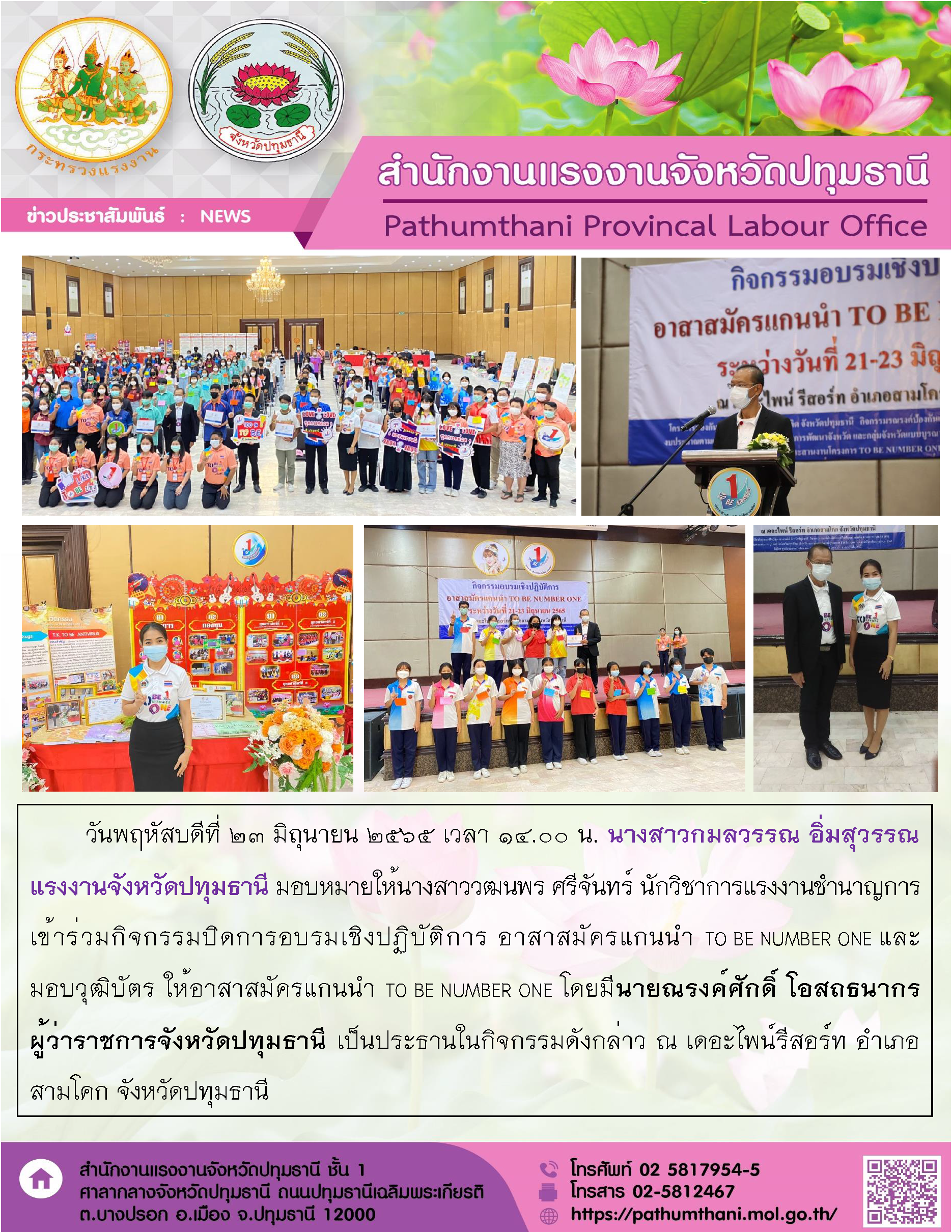 สำนักงานแรงงานจังหวัดปทุมธานี เข้าร่วมกิจกรรมปิดการอบรมเชิงปฏิบัติการอาสาสมัครแกนนำ TO BE NUMBER ONE และมอบวุฒิบัตร ให้อาสาสมัครแกนนำ TO BE NUMBER ONE
