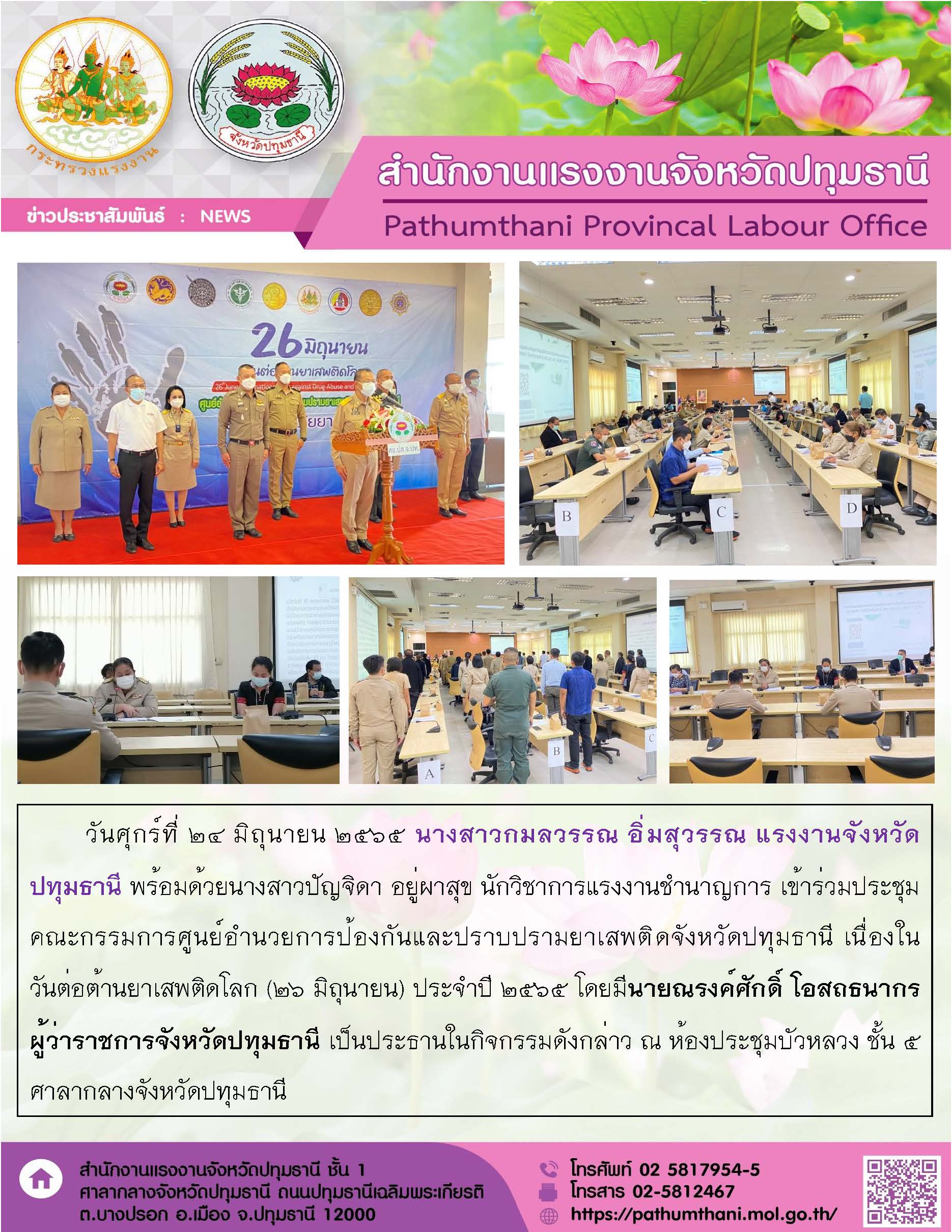 แรงงานจังหวัดปทุมธานี เข้าร่วมประชุมคณะกรรมการศูนย์อำนวยการป้องกัน และปราบปรามยาเสพติดจังหวัดปทุมธานี เนื่องในวันต่อต้านยาเสพติดโลก (26 มิถุนายน) ประจำปี 2565