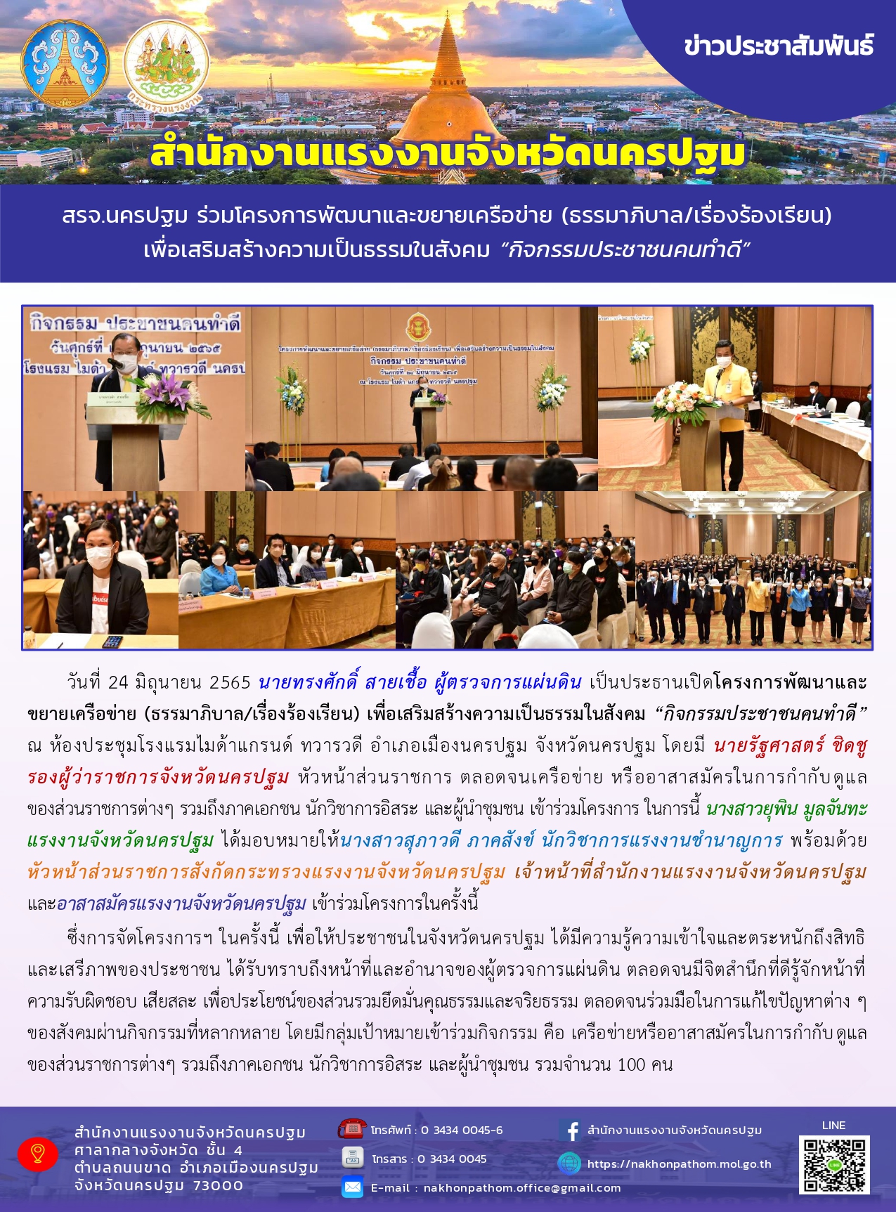 สรจ.นครปฐม ร่วมโครงการพัฒนาและขยายเครือข่าย (ธรรมาภิบาล/เรื่องร้องเรียน) เพื่อเสริมสร้างความเป็นธรรมในสังคม “กิจกรรมประชาชนคนทำดี”