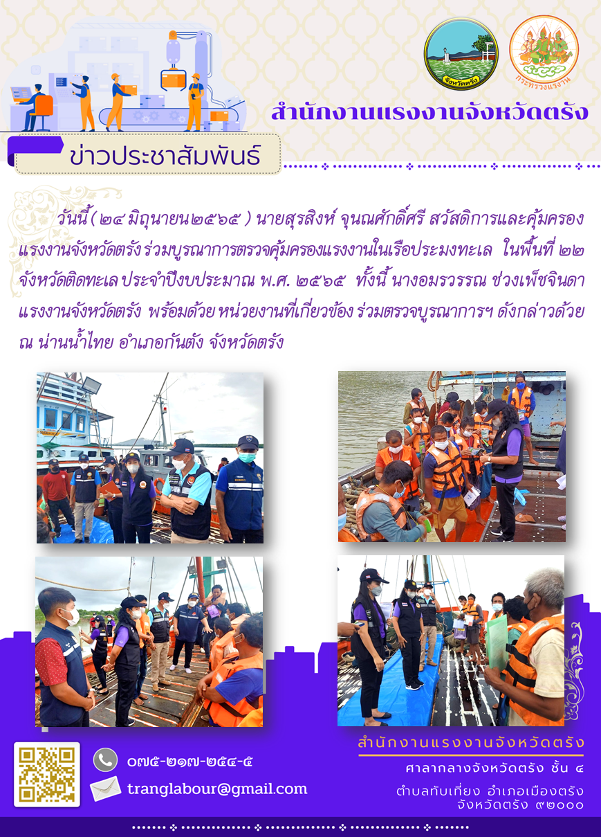 แรงงานจังหวัดตรัง ร่วมบูรณาการตรวจคุ้มครองแรงงานในเรือประมงทะเล ในพื้นที่ ๒๒ จังหวัดติดทะเล ประจำปีงบประมาณ พ.ศ. ๒๕๖๕