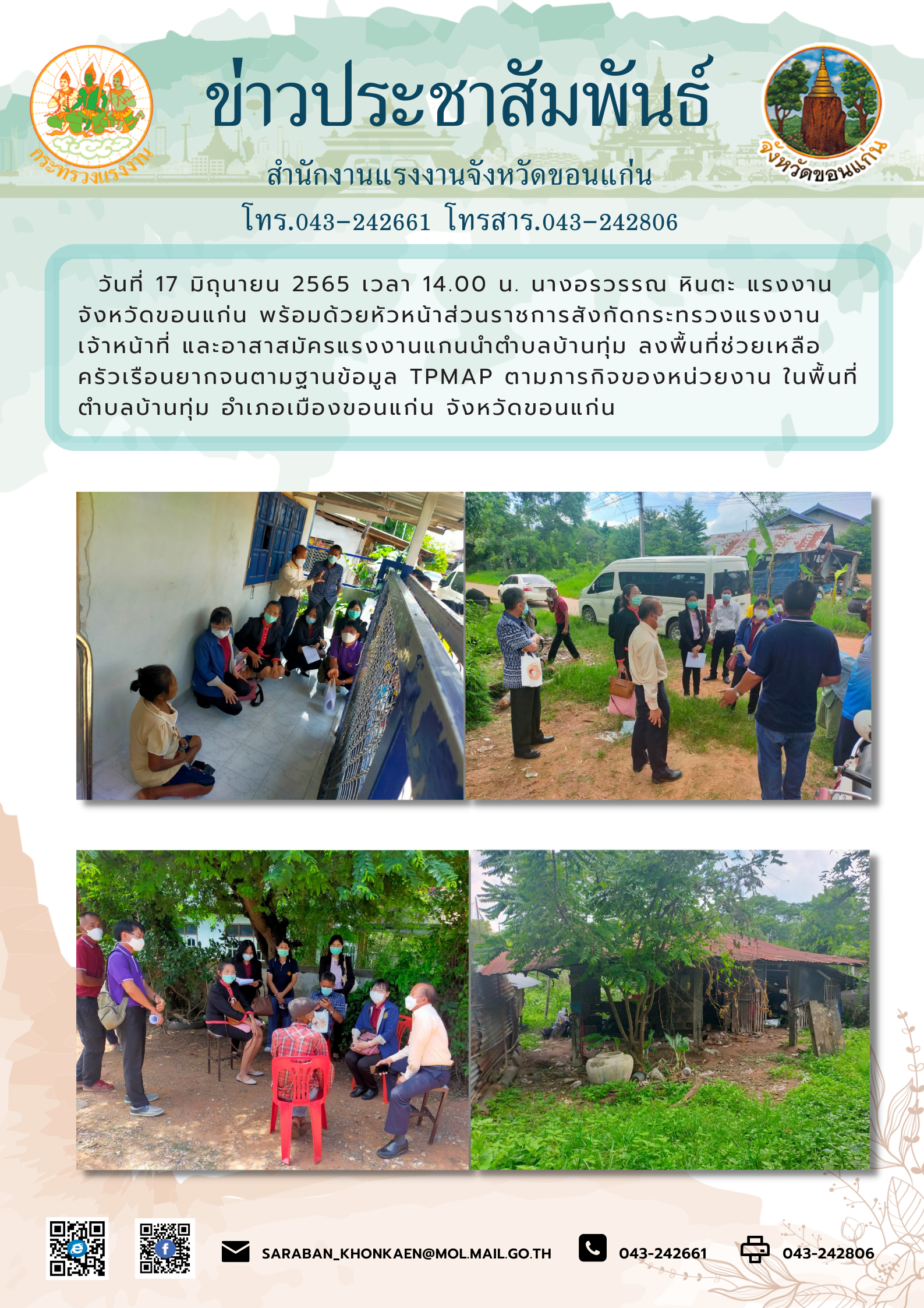 สำนักงานแรงงานจังหวัดขอนแก่นพร้อมด้วยหัวหน้าส่วนราชการสังกัดกระทรวงแรงงานจังหวัดขอนแก่น เจ้าหน้าที่ และอาสาสมัครแรงงาน ลงพื้นที่ช่วยเหลือครัวเรือนยากจนตามฐานข้อมูล TPMAP ตามภารกิจของหน่วยงาน