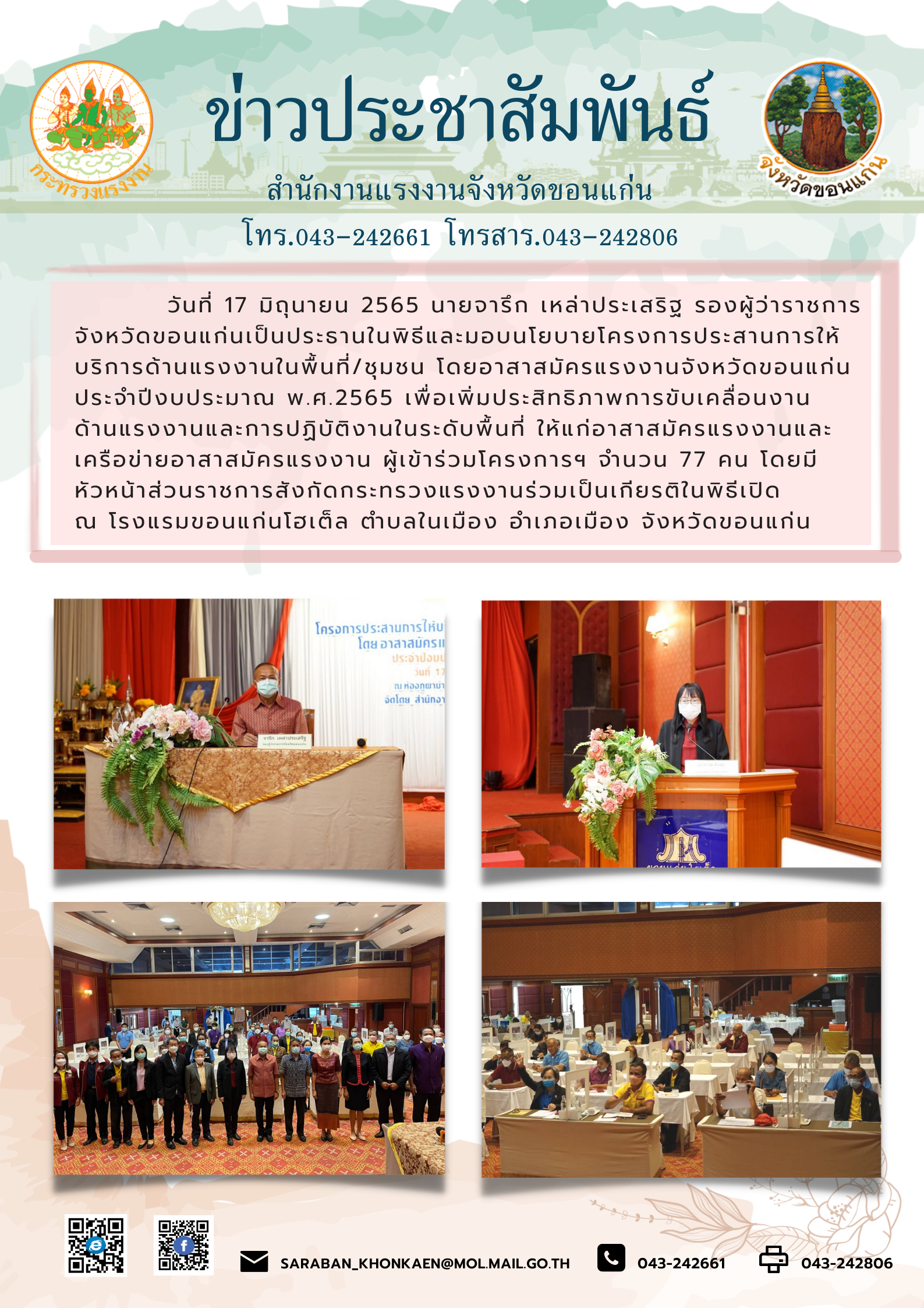 สำนักงานแรงงานจังหวัดขอนแก่นร่วมบูรณาการกับหน่วยงานสังกัดกระทรวงแรงงานจังหวัดขอนแก่น มอบนโยบายโครงการประสานการให้บริการด้านแรงงานในพื้นที่/ชุมชน โดยอาสาสมัครแรงงานจังหวัดขอนแก่น